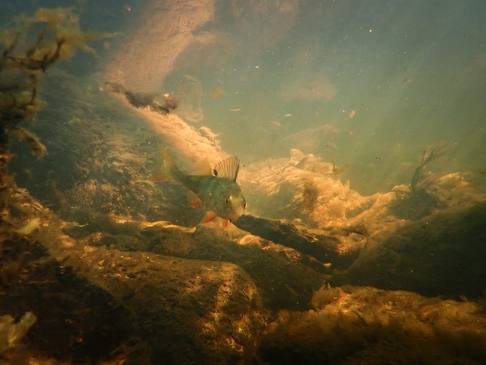 Pieniä ahvenia tuntuu olevan koko joki täynnä. Pinnalta katsoessa niitä ei näe.