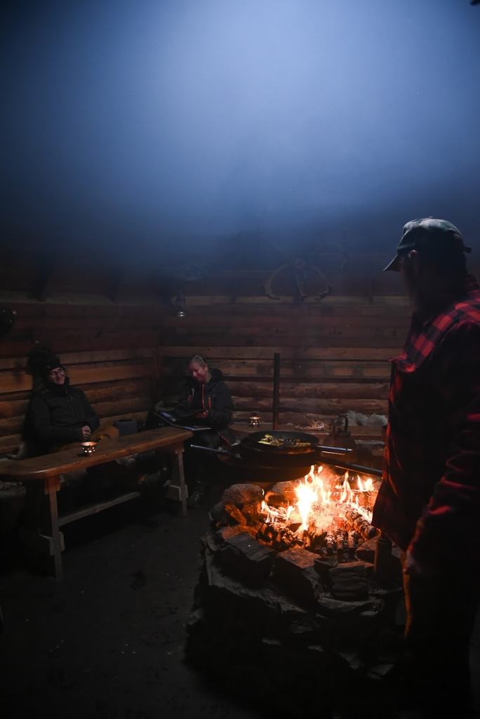 Kodassa oli mahtavan lämmin. Istahdimme alas porontaljoille, ja Jari alkoi valmistaa meille lounasta. Tarjolla olisi paikallista haukea ja puikulaa sekä viereisen metsän tateista tehtyä kastiketta.