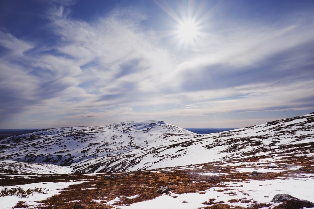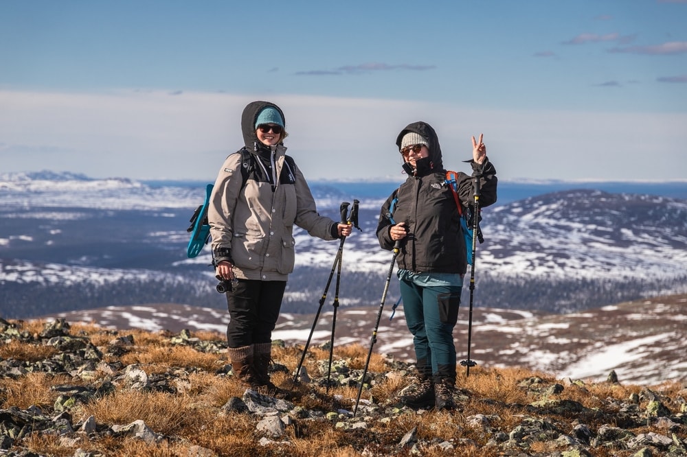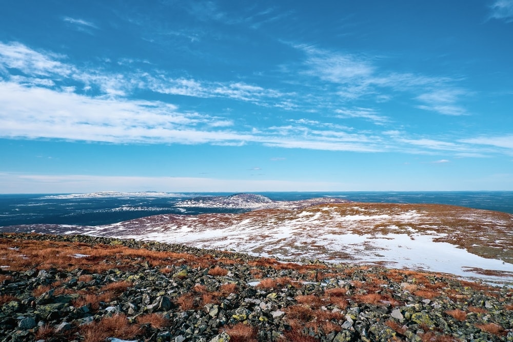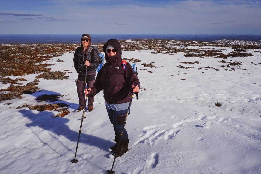 Kevät helli auringolla. Onneksi, sillä lunta oli yllättävän paljon jäljellä vielä ylhäälläkin tunturissa (ja kunto talven jäljeltä huono), joten matkanteko oli hidasta. Oli ihana saada edetä kaikessa rauhassa, turhia hengästymättä ja maisemia ihaillen, kun ei ollut pelkoa pimeän laskeutumisesta. Yötön yö alkaa melko pian.