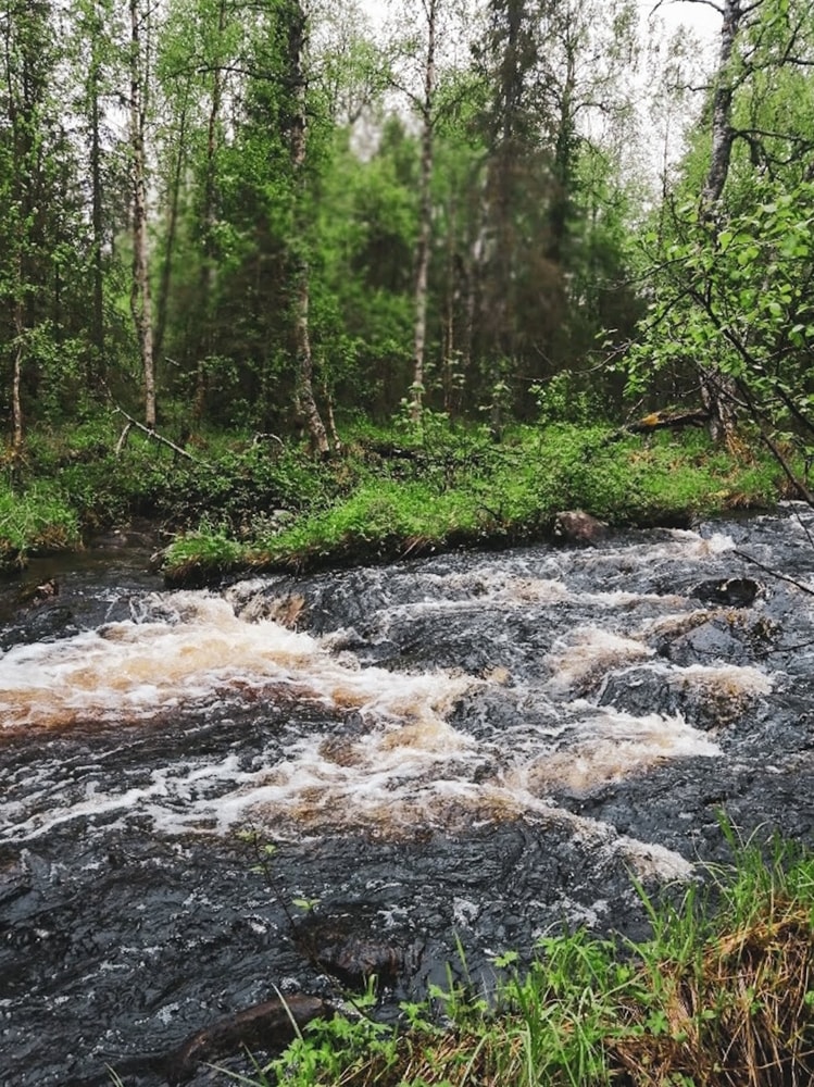 Koskia oli ihana katsella. Kuohuvaa, tummaa vettä reunustivat rentukat sekä kaunis, vanha metsä kaatuneine puineen. Moni koivuista oli kaartunut kosken ylle tai kaatunut koskeen.