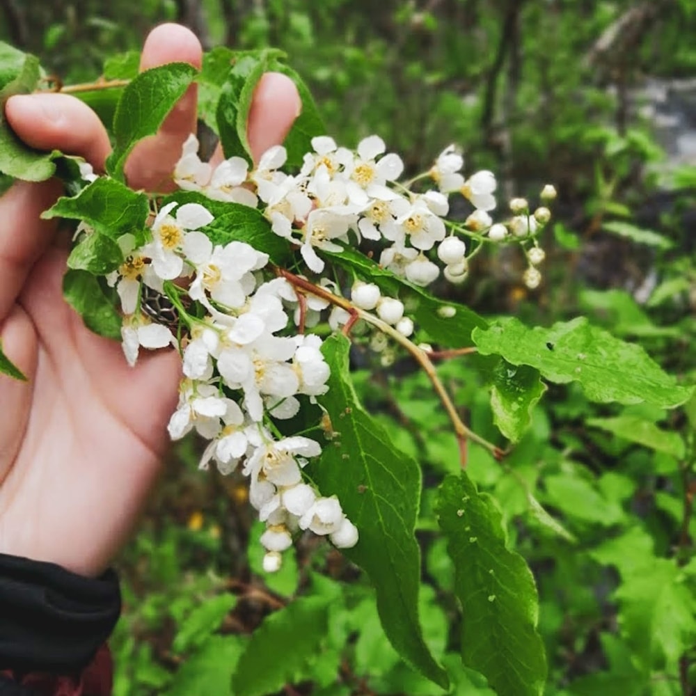 Tein tänään Sodankylästä vierailulle saapuneen ystävän kanssa retken lähimetsään. Vein hänet katsomaan koskia, ja kosken rannalta löysimme kukkivan tuomen.