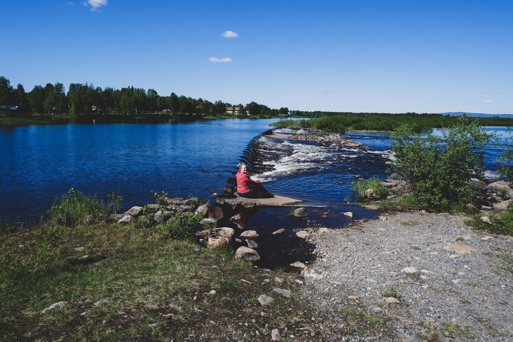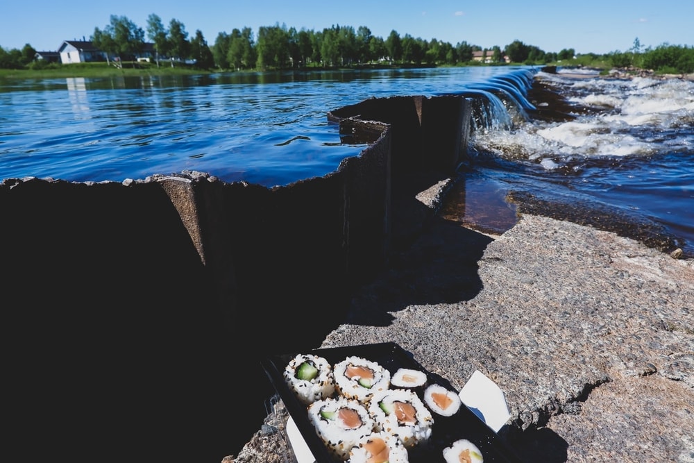 Haettiin Kittilän K-Supermarketista evästä. Siellä on ihan törkeän hyvä tuoretiski. Mä valkkasin mukaan sushia ja mies otti täytetyn patongin. Ajettiin Karinnokan lintutornille, jossa mentiin kosken rantaan syömään.