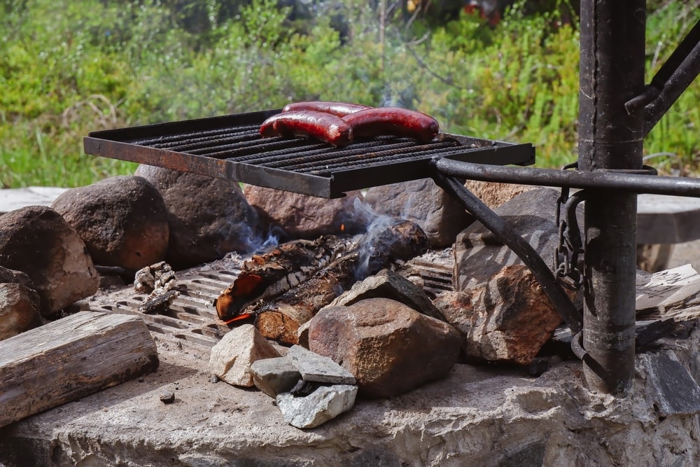 Nuotiopaikalla kyti tuli jo valmiina. Lisäsimme pari puuta ja aloimme paistaa lounasmakkaroita.