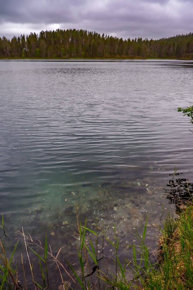 Minulla oli uimakamppeet mukana, sillä olin ajatellut käydä katsastamassa yhden samalla suunnalla olevan pienen järven, jota uumoilin kirkasvetiseksi. Ja niinhän se olikin. Jätimme auton P-paikalle, jossa oli pari turistiseuruetta, ja kävelimme rantaa pitkin järven autiolle vastarannalle. Minulla oli uimapuku valmiiksi vaatteiden alla, joten riisuin vaatteet ja puin ylle uimakengät ja sukelluslasit sekä snorkkelin. Sitten kävelin veteen, joka oli lämpimämpää kuin olin odottanut.