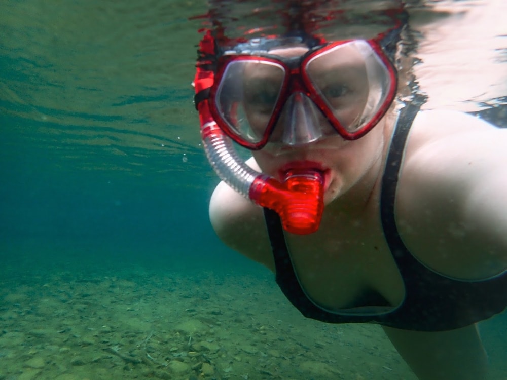 Ilma oli yhdeksän astetta lämmintä ja satoi vettä, mutta pinnan alla oli mukavan rauhallista ja kaunista. Vesi oli satumaisen kirkasta ja turkoosia, siellä oli tosi hyvä olla. Snorklasin oikein kunnon tovin, koska kylmä ei ajanut minua sieltä ylös. Toivoin näkeväni kaloja, mutta niitä ei kyllä näkynyt. Pohjassa oli melkeinpä vain hiekkaa ja puunrunkoja, ja valitettavasti joitakin tupakantumppeja sekä tyhjä alumiinitölkki.