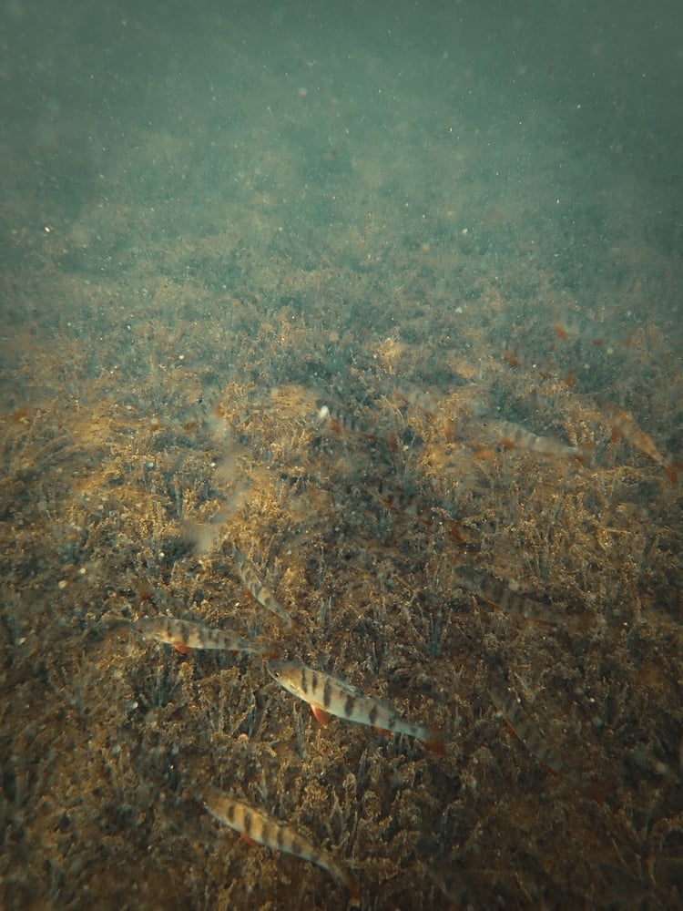 Ahvenia oli pohjalla joka suunnassa niin kauas kuin silmä kantoi. Otin paljon kuvia, mutta niistä vain kaksi onnistui edes välttävästi. Järven pohjasta nousi höttöä, ja vedenalaiskameran on niin kovin vaikea nähdä vedessä leijuvasta hötöstä ohitse.