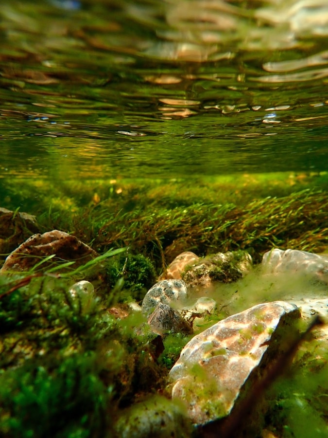 Pilvet olivat alkaneet kerääntyä taivaalle, ja haave aurinkoisesta uintiretkestä jäi haaveeksi. Menin kuitenkin veteen katselemaan, näkyisikö pinnan alla mitään mielenkiintoista.