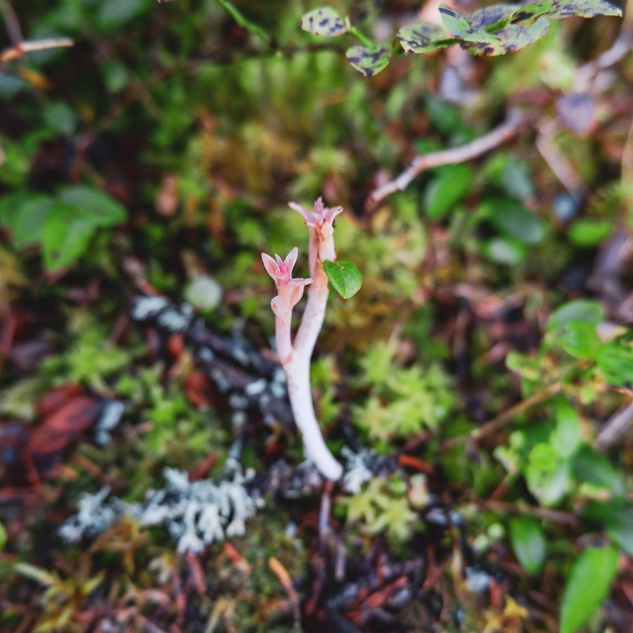 Polulla kasvoi kummallisen näköinen, melkein kuin sienimäinen, vaaleanpunainen kasvi, jolla näytti olevan pari puolukanlehteä. Mikä lienee?
