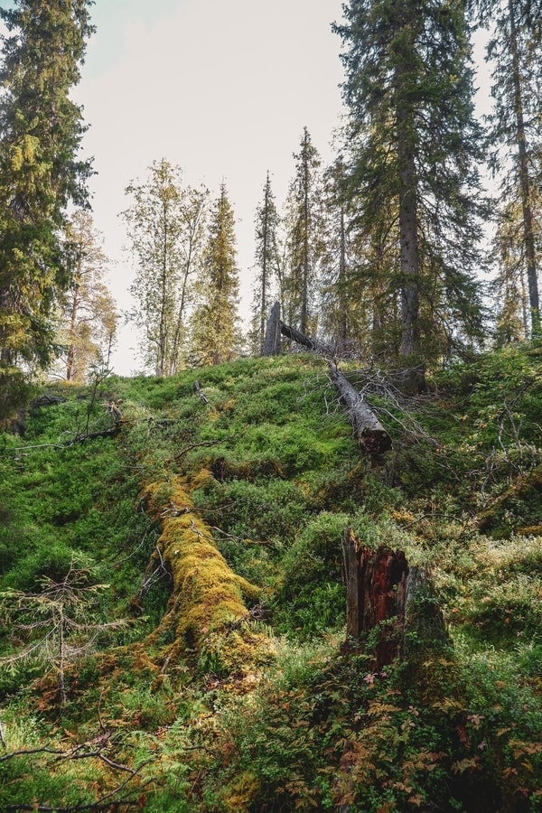 Metsän tunnelma vaihteli paljon sen mukaan, missä kuljimme. Punaisena hohtava kuiva kangas muuttui hetkessä synkäksi ja märäksi kuusikoksi, jossa oli paljon suuria, kaatuneita puita. Kuljettiin ylös alas – maasto kumpuili kummallisesti. Yhtäkkiä jostain läheltä kuului poron röhkinää ja ehdin jo hieman huolestua, hyökkääkö joku hirvas kohta kimppuumme. Minulle on kerrottu, että rykimäaika alkaa puolukoiden ollessa kypsiä. Onneksi mitään ei näkynyt.