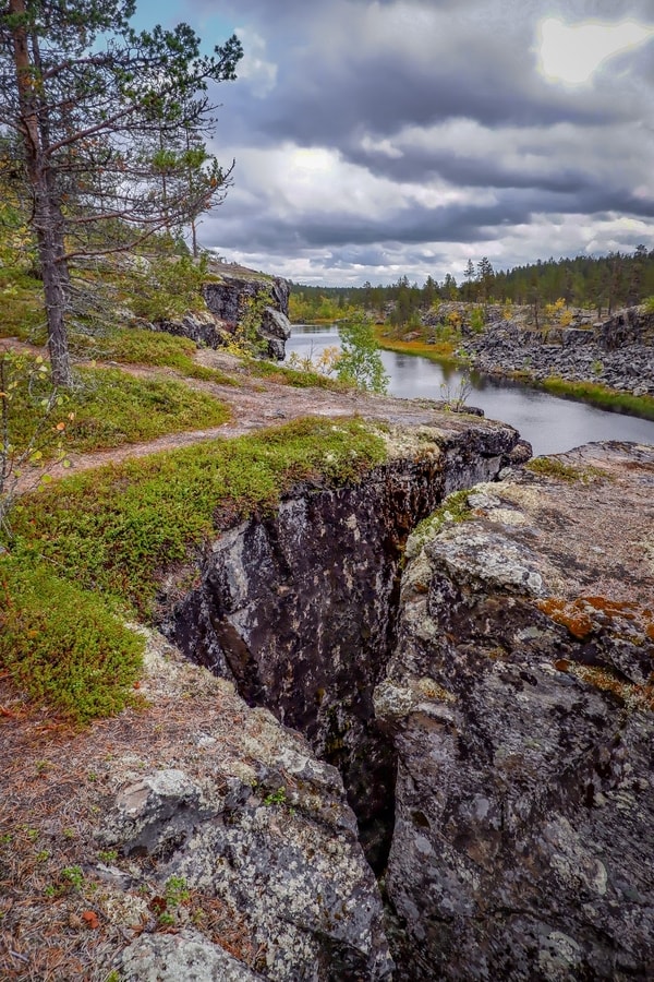 Lähdimme seuraamaan polkua kohti Taatsinkirkkoa, joka on iso ja pystysuora kallionkieleke pienen matkan päässä seidasta. Yksi valtava kivipaasi on revennyt muusta kalliosta niin, että väliin jää noin metrin leveä, syvä rotko.