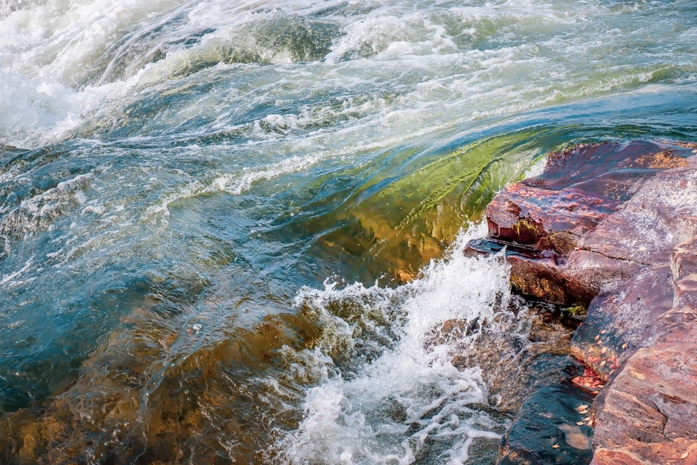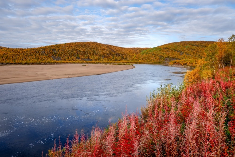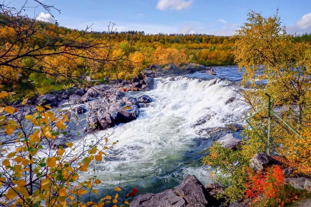 Norjassa pienen matkan päässä ylitettiin Neidenin valtava koski. Turkoosi-valkoinen koski näytti ruskan keskellä ihanalta. Olin aiemmin nähnyt siitä kuvia, mutta kuvitellut sen pienemmäksi. Laskeuduimme tosi jyrkkää polkua alas kallioille katsomaan sitä lähempää.