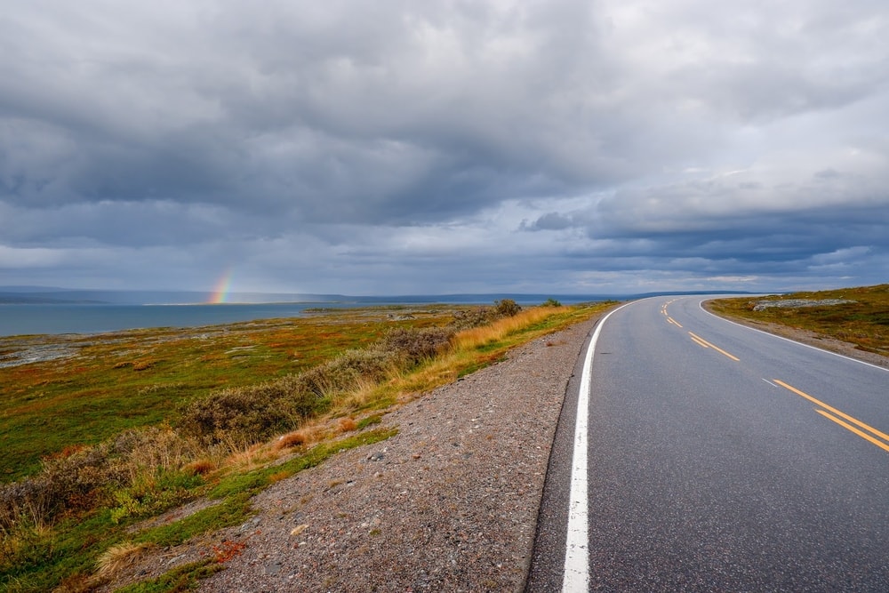 Tie eteni Varanginvuonon rantoja pitkin. Merellä näkyi ihana sateenkaaren pää.