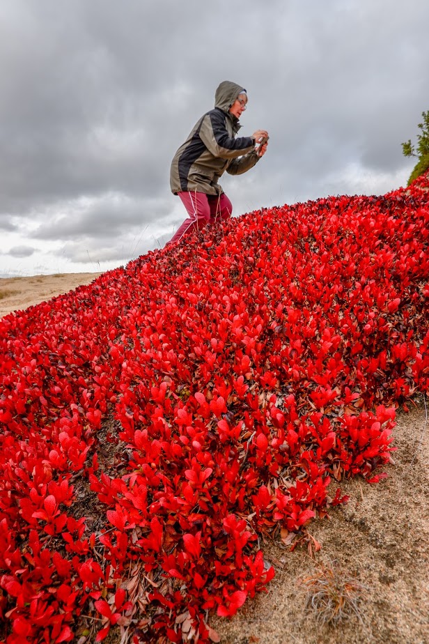 Maisema ylhäältä on todella hieno. Paikka on hyvin erikoinen, en muista ihan vastaavaa muualla nähneeni. Äidin kanssa kiipesimme jyrkän hiekkaseinämän ylös ja lorvimme loivempia kohtia myöten takaisin alas, punaisia riekonmarjamattoja kuvaten ja marjoja syöden.