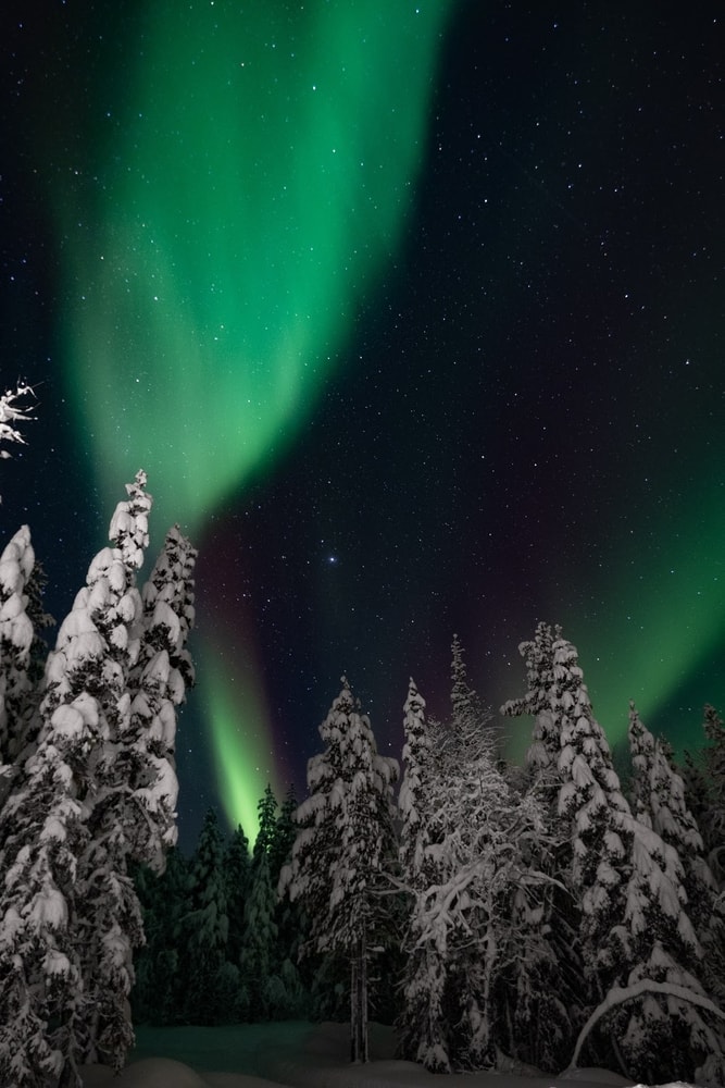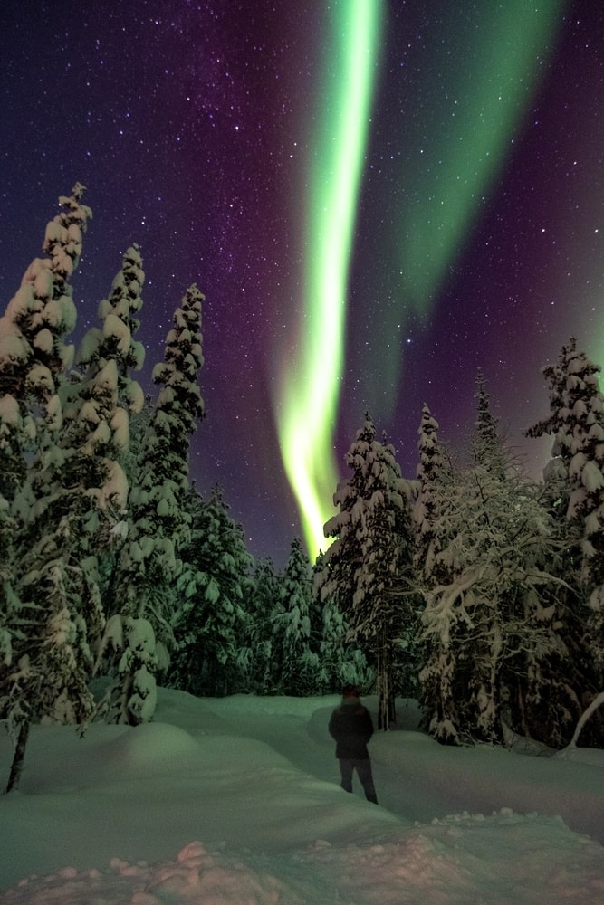 Loimut oikeasti valaisivat maailman, mikä ei ole ihan jokailtaista. Metsien ja hankien yllä oli aavemainen vihreä valo.