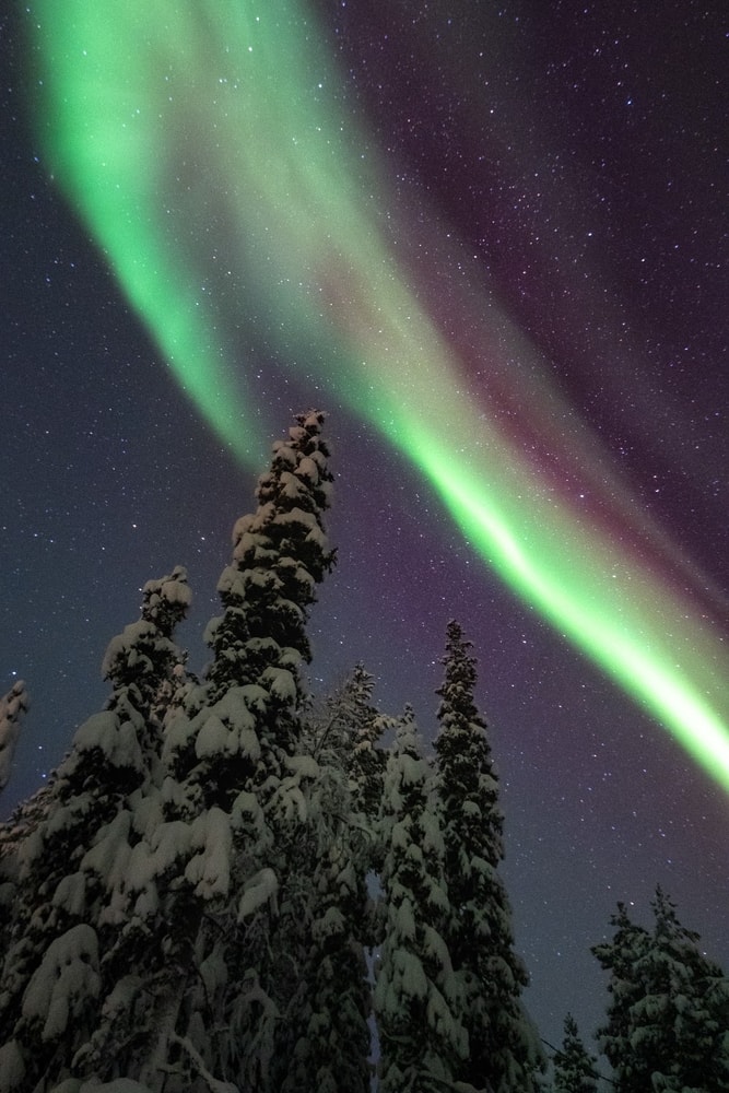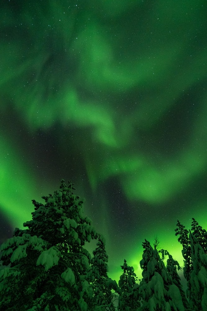Se mikä oli alkanut ohuena luiruna taivaan halki, humahti yhtäkkiä koko taivaankannen peittäväksi vihreäksi. Revontulet elivät hurjaa vauhtia, väreilivät, kiemurtelivat ja vaihtoivat väriä. Nämä olivat yksiä hienoimmista näkemistäni revontulista.