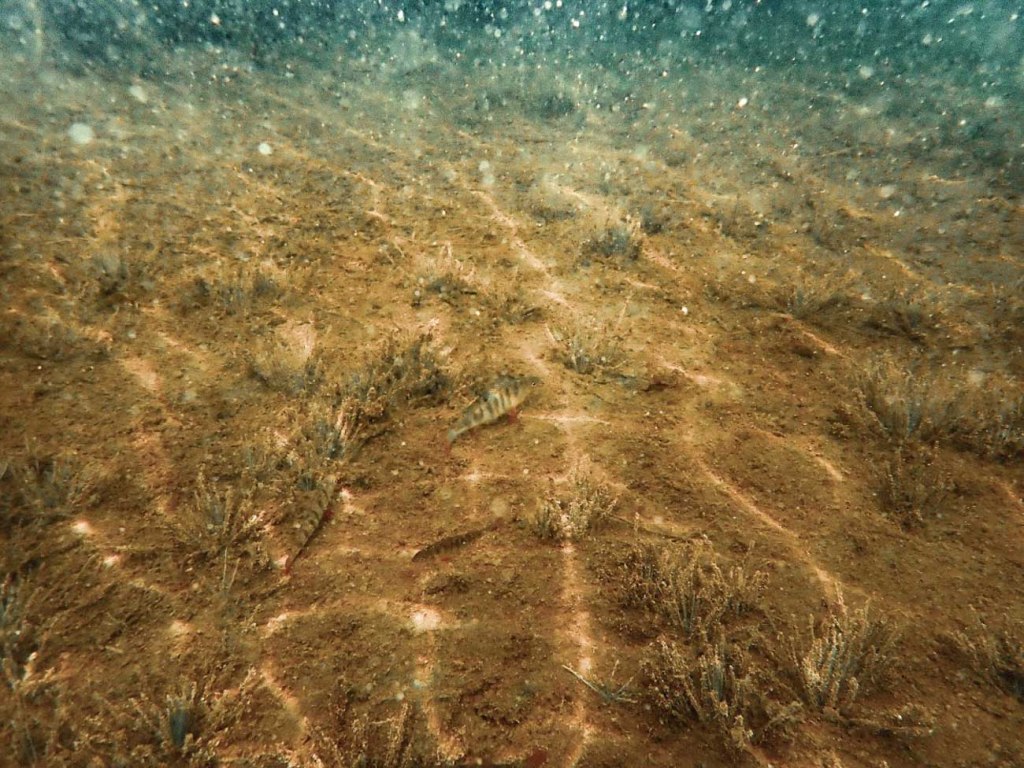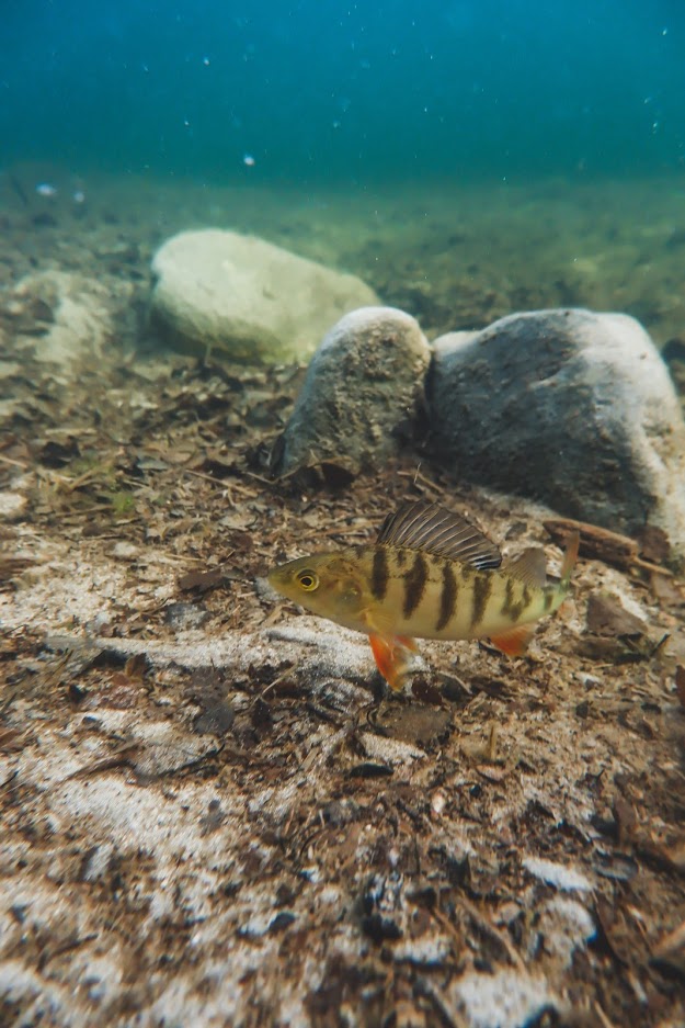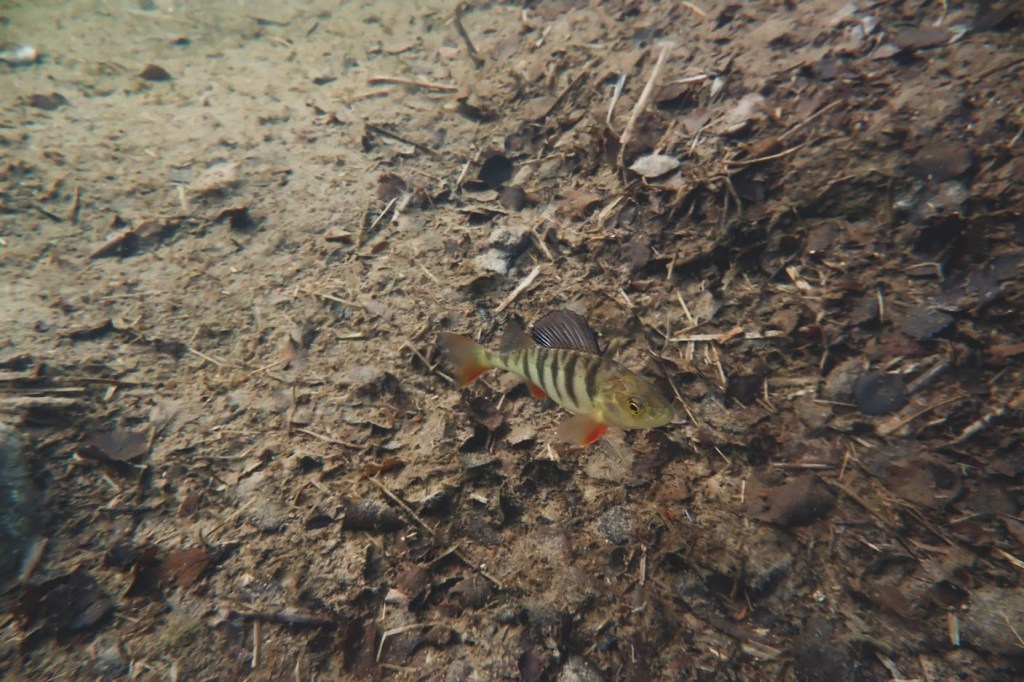 Kala pyöri ympyrää suoraan alapuolellani ja oli sellaisessa hassussa kenottavassa asennossa, jossa ahvenet tapaavat olla, kun ne mulkoilevat ylöspäin. Selkäevä terhakkaana pystyssä ja erittäin tarkkaavainen ilme kasvoillaan. Olin niin iloinen tästä kohtaamisesta, sain lisää buustia etsiä aina vain uusia mahdollisuuksia kuvata kaloja uudella kameralla.