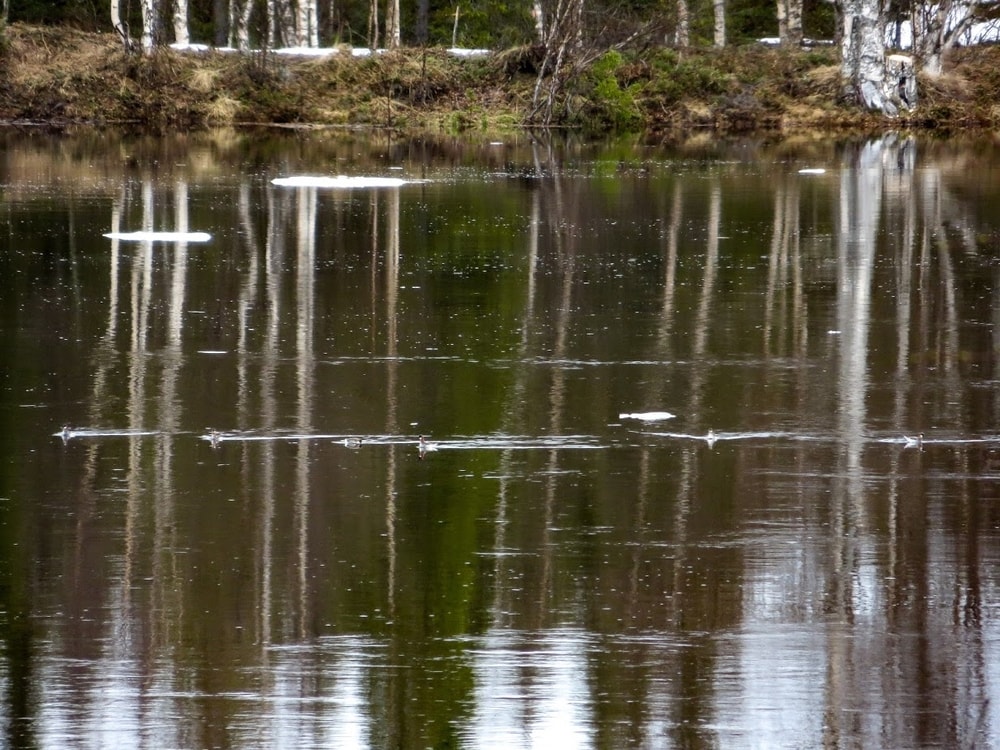 Yhtenä päivänä töitä tehdessä huomasin, että joelle laskeutui kummallisen näköinen lintuparvi. Lintujen muoto ja lentotapa kertoi, että ne olivat kahlaajia, ja aika pieniäkin vielä. Tuntui aivan oudolta, että kahlaajaparvi laskeutuisi uimaan keskelle joenselkää (kahlaajat eivät yleensä ui), joten otin kiikarit ja tarkistin keitä tulijat olivat. Ne olivat vesipääskyjä! Kameran paraskaan zuumi ei aivan yltänyt lintuihin saakka että olisin saanut kovin hyvää kuvaa, mutta yhden pienen kuvamuiston silti sain tästä eloisasta parvesta, ennen kuin ne vain hetkeä myöhemmin nousivat jälleen lentoon ja jatkoivat matkaansa.