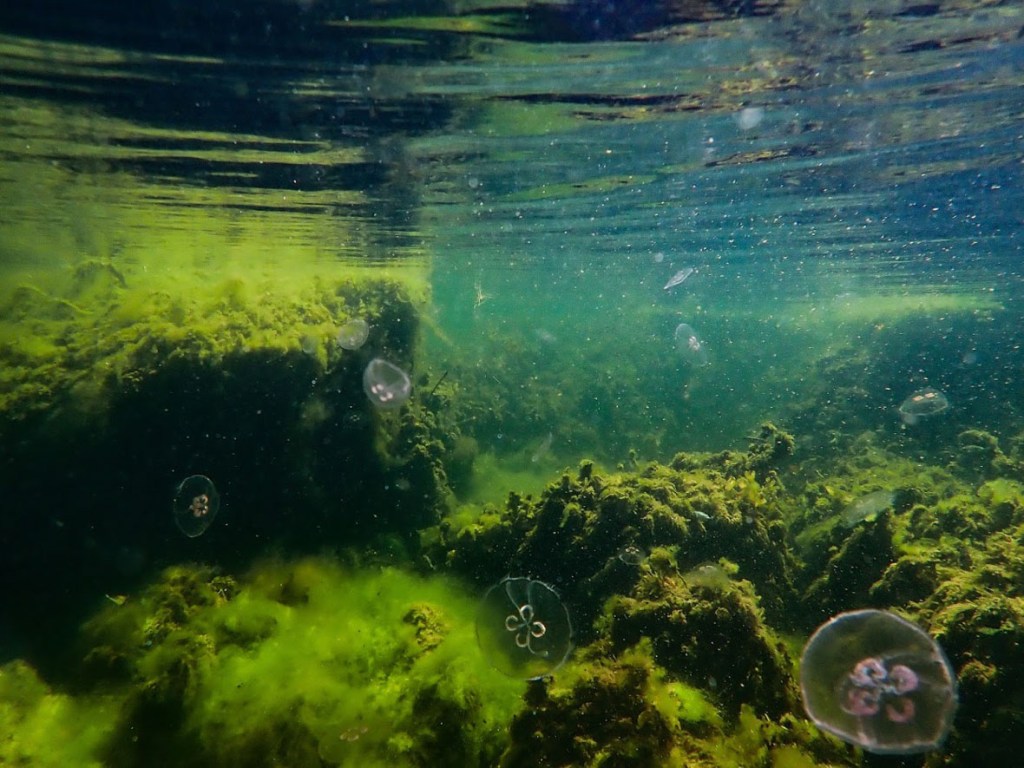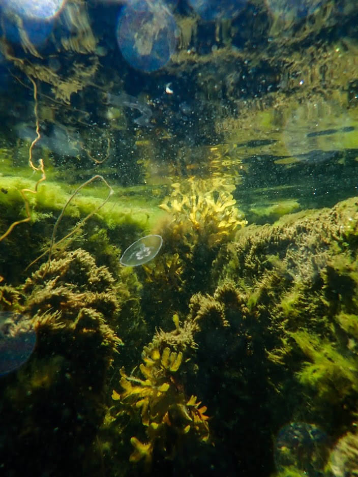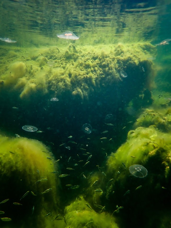 Laguunin yhdisti mereen vain ohut, noin puoli metriä syvä ja ehkä metrin leveä pullonkaula kallioiden välissä. Laguunissa ei ollut virtausta, vaan rauhallisen satumainen tunnelma. Lukemattomat kolmipiikit ja meduusat leijuivat kanssani vedessä, kaikessa rauhassa, lämpimän kesäauringon alla. Vesi oli lämmintä ja kirkasta.