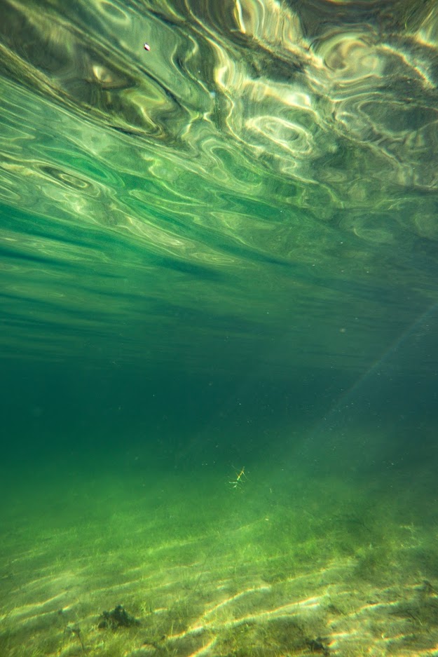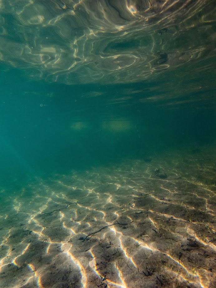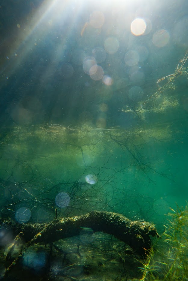 Rannassa meitä odotti upea näky. Järvi ammotti aika tiheän ja hämäränkin metsän sylissä turkoosina ja aurinkoisena keitaana. Vaihdoin uimapuvun päälle ja lähdin pinnan alle katselemaan maisemia.