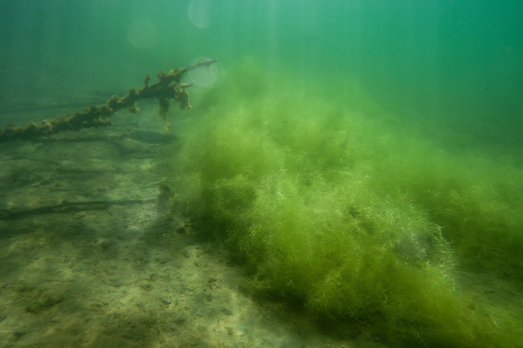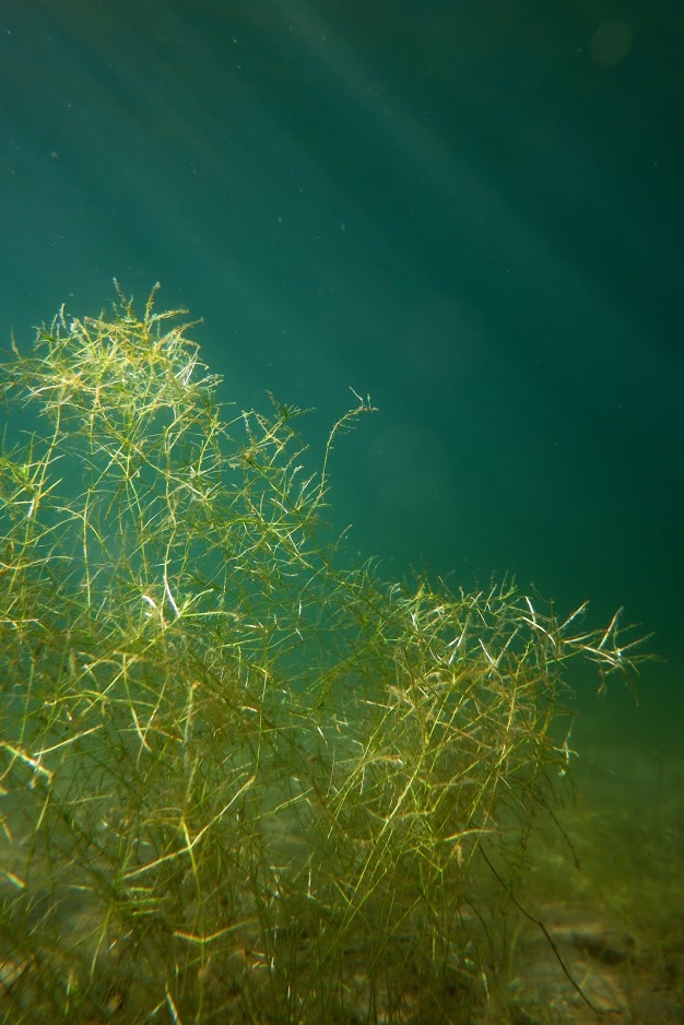 Vedessä kasvoi pehmeältä näyttäneitä vaaleanvihreitä pöheikköjä. Mahtaako näillä juuria ollakaan, vai leijuvatko vain ympäriinsä?
