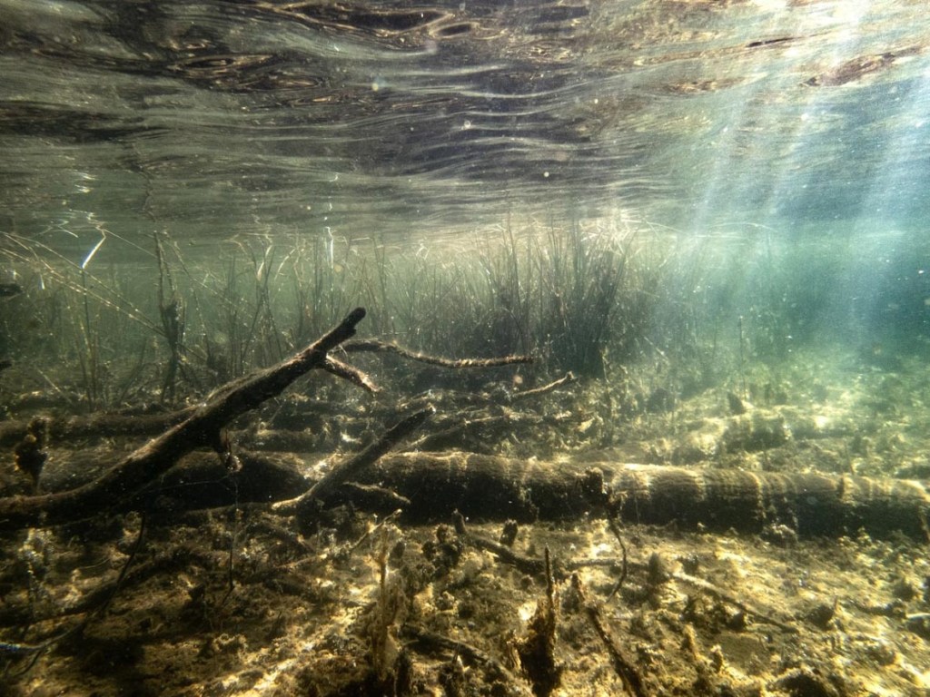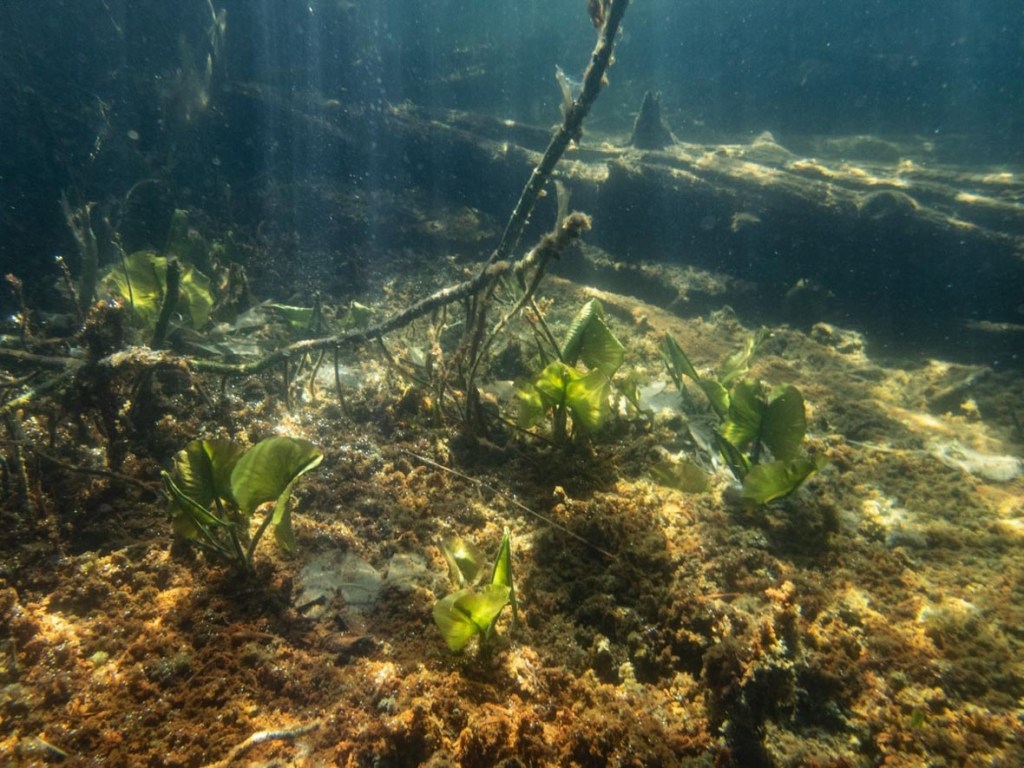 Lummekasvien taimet kurkottelivat pohjassa jo kohti pintaa. Tänne voisi olla hienoa palata elokuun loppupuolella, vesikasvien ollessa rehevimmillään.