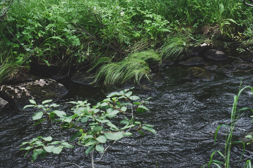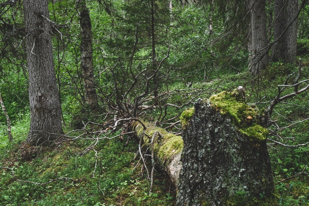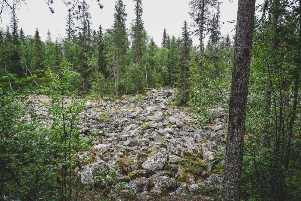 Metsässä on paljon kaatuneita puita ja kaikenlaista maastoa, rakkaa, joenrantaa, kuusikkoa ja männikköä.