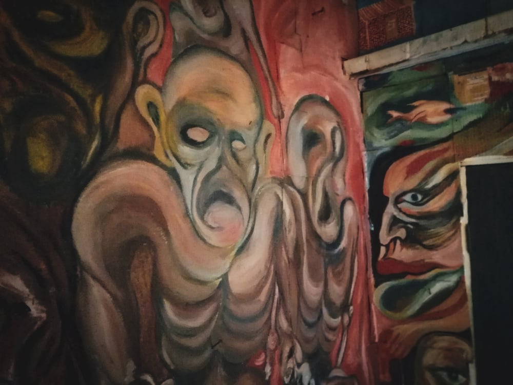 Yksi työhuoneen seinistä on maalattu täyteen aika pelottavia hahmoja. Oven yläpuolella oli kyltti: Ovenraosta kuseminen sallittu.