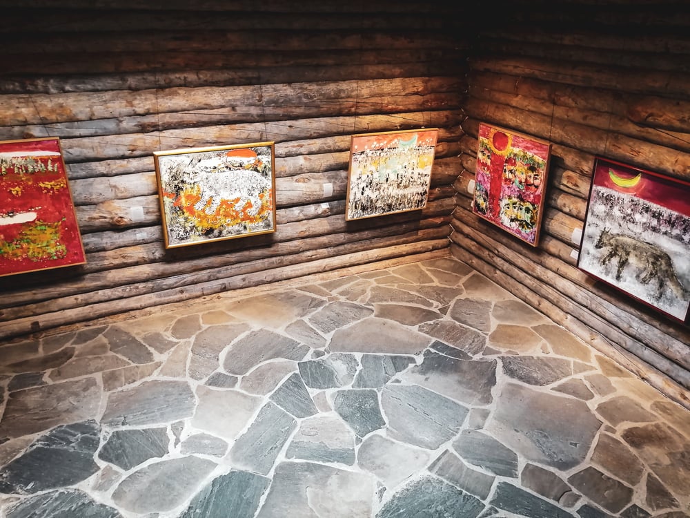 Viimeisenä saavuimme galleriaan, jossa taulut ovat esillä. Kelohirsinen jättirakennus sijaitsee metsän suojassa lähellä jokea.