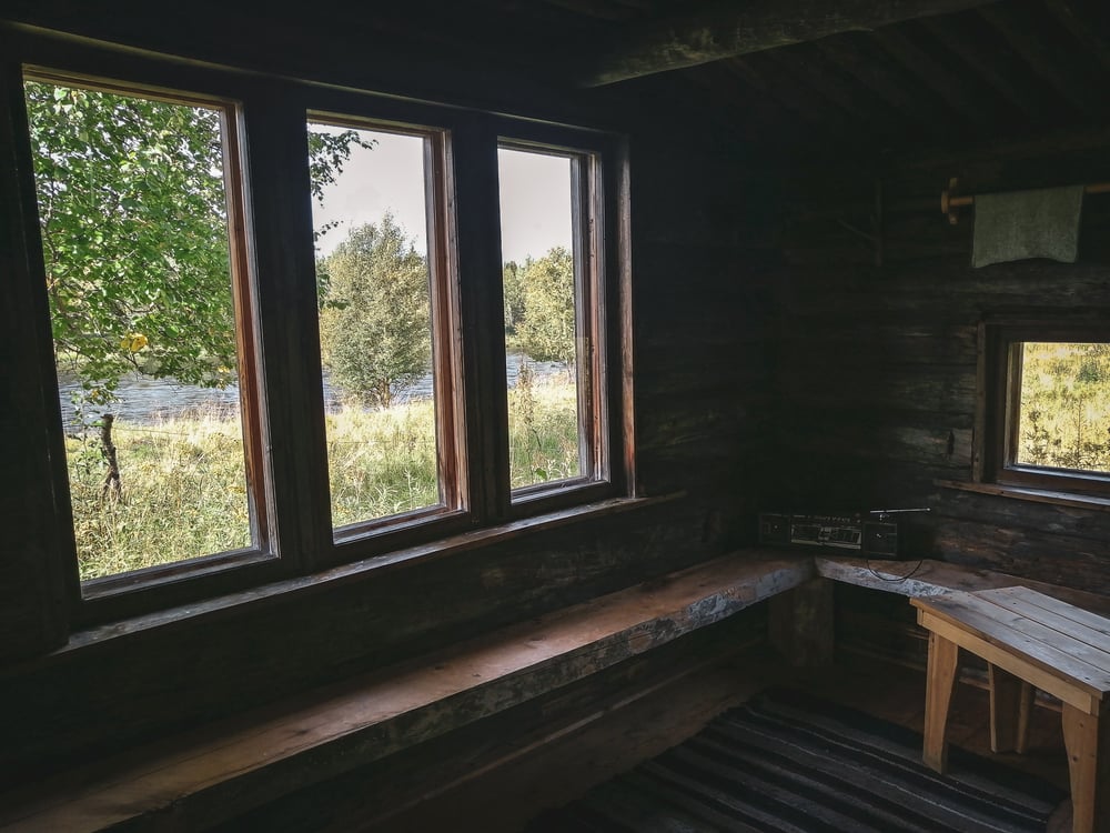 Kaunis syyspäivä houkutteli minut päärakennuksen ohi kohti rantasaunaa. Oli kiva huomata, että saunan ovi oli auki – en muista koskaan aiemmin käyneeni sisällä. Saunan tuvasta oli kaunis näkymä Ounasjoelle.