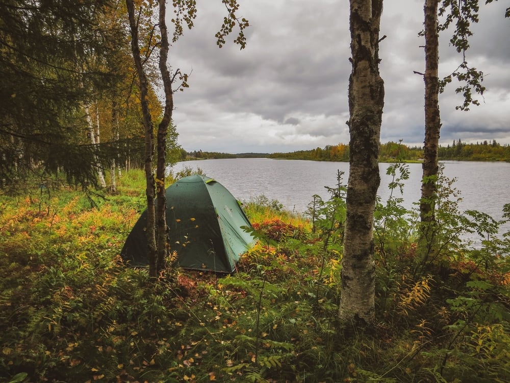 Pystytimme teltan hyvälle paikalle ja aion käydä nukkumassa siellä vielä pitkälle syksyyn. Tällä hetkellä teltta on keskellä kaunista maaruskaa. Hillan, ruohokanukan ja maitohorsman lehdet ovat upean punaisia.