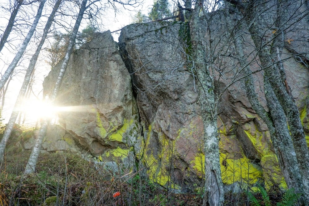 Kallio tunnetaan Kiteellä ilmeisen laajalti, ja me olimme nähneet siitä kuvamateriaalia eri dokumenteista. En kuitenkaan ollut tiennyt, kuinka vaikuttava kallionseinämä on sen juurelta katsottuna. Tutkimme pitkän aikaa sen muotoja ja värejä, korkeasta halkeamasta aina pienimpiin sieniin ja jäkäliin.