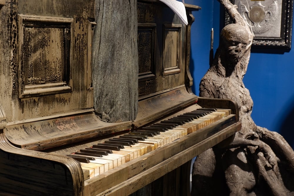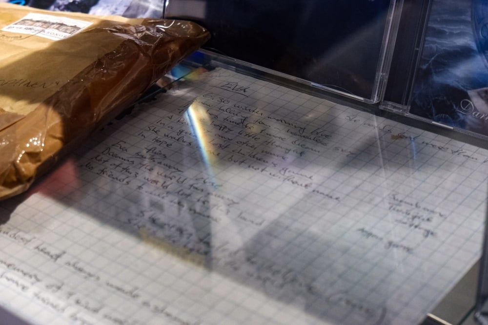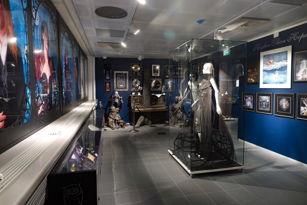 Sitten oli aika siirtyä näyttelyyn. Ulkoa päin vaatimattoman näköinen paikka kätki sisäänsä mitä hienoimmat tilat ja ihmeen paljon nähtävää – se oli huomattavasti isompi kuin millaisen käsityksen olin siitä saanut nettiuutisten pohjalta. Nähtävänä oli monia mielenkiintoisia esineitä ja muuta materiaalia aikojen saatosta, mm. musiikkivideoiden rekvisiittaa kuten Élanin piano sekä Noisen häkkimekko ja kuninkaan kruunu.