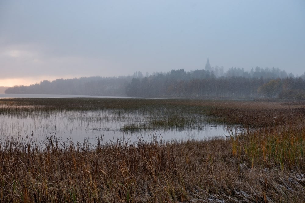 Lähdimme ajamaan kohti kotia Tohmajärven kautta nähdäksemme vielä lisää itsellemme vieraita kulmakuntia, mutta ensimmäinen yllätyspysähdys tulikin jo Kiteen keskustassa, jossa näimme upean auringonnousun sekä lumisateen läpi kauniisti erottuvan kirkon profiilin korkealla mäellä.