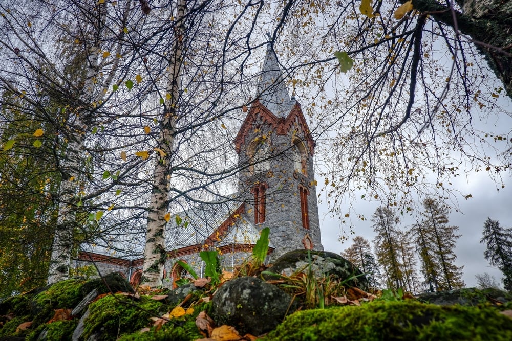 Kallion laelta löytyi dokumenteista tuttuja näkyjä, veneestä tehty saarnastuoli ja korkea pikku katos, jota olin aina luullut kaivoksi, mutta sehän oli tietenkin metsäkirkon kellotapuli.