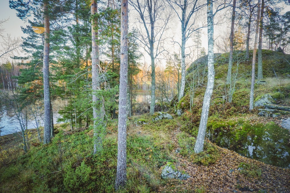 Auringon pilkahtaessa oli aika lähteä vielä yhtä paikkaa katsomaan, nimittäin Valkiajärveä. Kyllä, oli lokakuu ja harmaan sadepäivän lämpötila taisi olla neljä astetta, mutta olin ajatellut että kun Kiteelle kerran tullaan, käyn myös snorklaamassa Valkiajärvessä. Ajelimme mieheni kanssa paikalle kahdestaan ja kävelimme parkkipaikalta metsän halki lähes uima-altaanturkoosin järven rantaan.