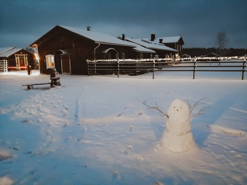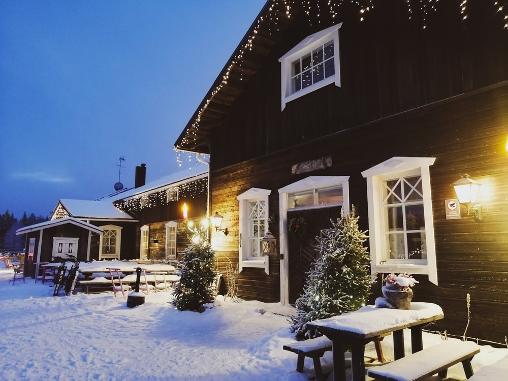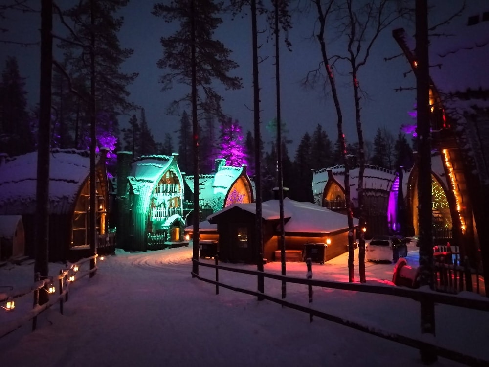 Tonttulasta ajeltiin itsellemme kokonaan uuteen paikkaan, Levin toiselle puolelle Arcandiaan. Osuttiin paikalle sattumalta avausminuutilla, eikä sielläkään ollut muita. Paikka oli vaikuttavampi kuin mitä olin odottanut. Tekemättä aikoinaan jääneen elokuvan lavasterakennukset oli valaistu hienosti, samoin ympärillä oleva metsä. Ulkona soi elokuvamainen, mahtipontisen komea musiikki ja paikassa oli todella hieno, suorastaan jylhä tunnelma. Kuin olisi itse ollut keskellä elokuvaa. Tuntui mukavalta saada kokea se melkein yksityisesti, kun ketään muuta ei ollut missään. Hetken aikaa pihalla pyörittyämme menimme sisälle kahvilaan, jossa joimme vielä kuumat kaakaot ja vaihdoimme muutaman sanan paikan työntekijän kanssa.