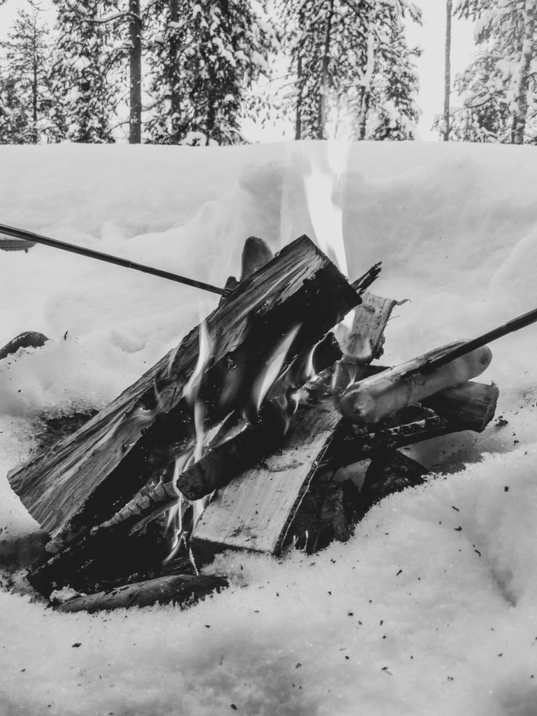 Meillä oli laavulla omat puut mukana. Miehen tehdessä tulia minä harjasin ja lapioin laavun edustaa puhtaaksi lumesta, jota olikin kertynyt paljon.