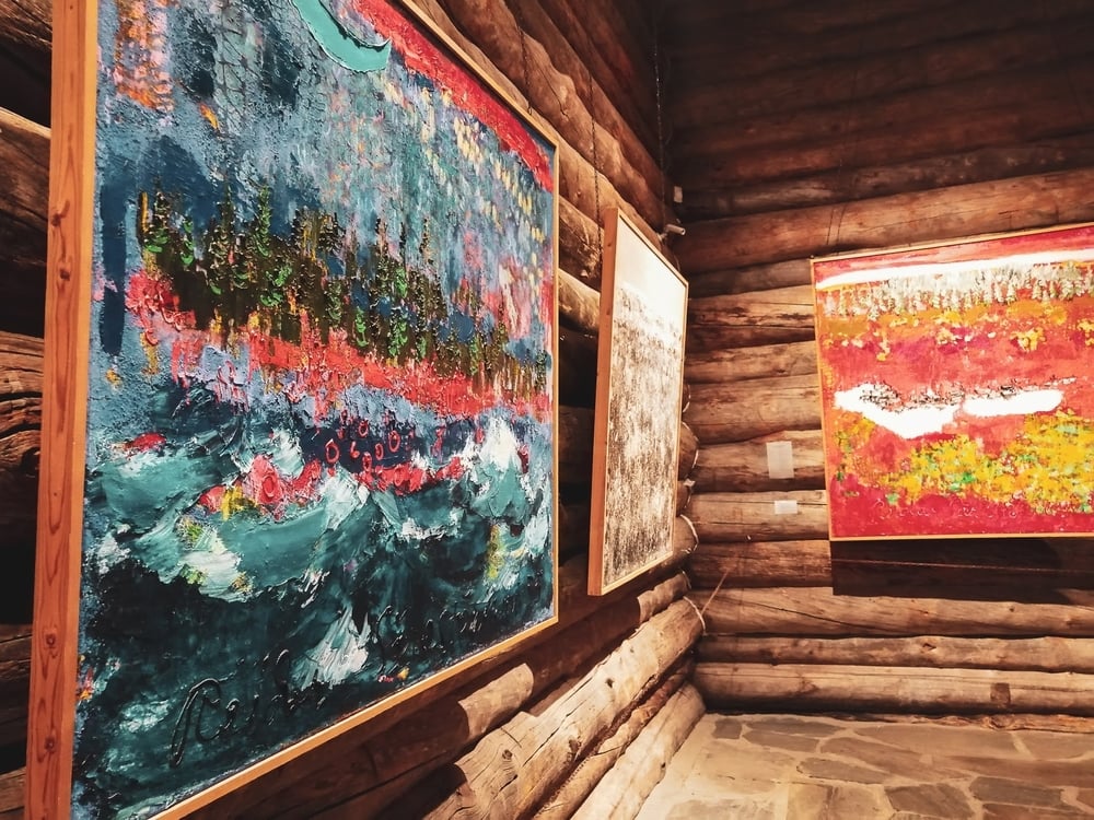 Vanhan Särestön jälkeen nousimme kulkusuunnan mukaisesti mäen laelle ateljeehen, ja sitten samoilimme metsän poikki galleriaan, joka on alueen päänähtävyys. Lumisade petrasi, mutta alueen lumityöt oli tehty niin viimeisen päälle, että metsän keskellä lumikäytävillä kulkeminen tuntui suorastaan juhlavalta.