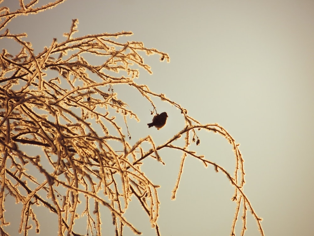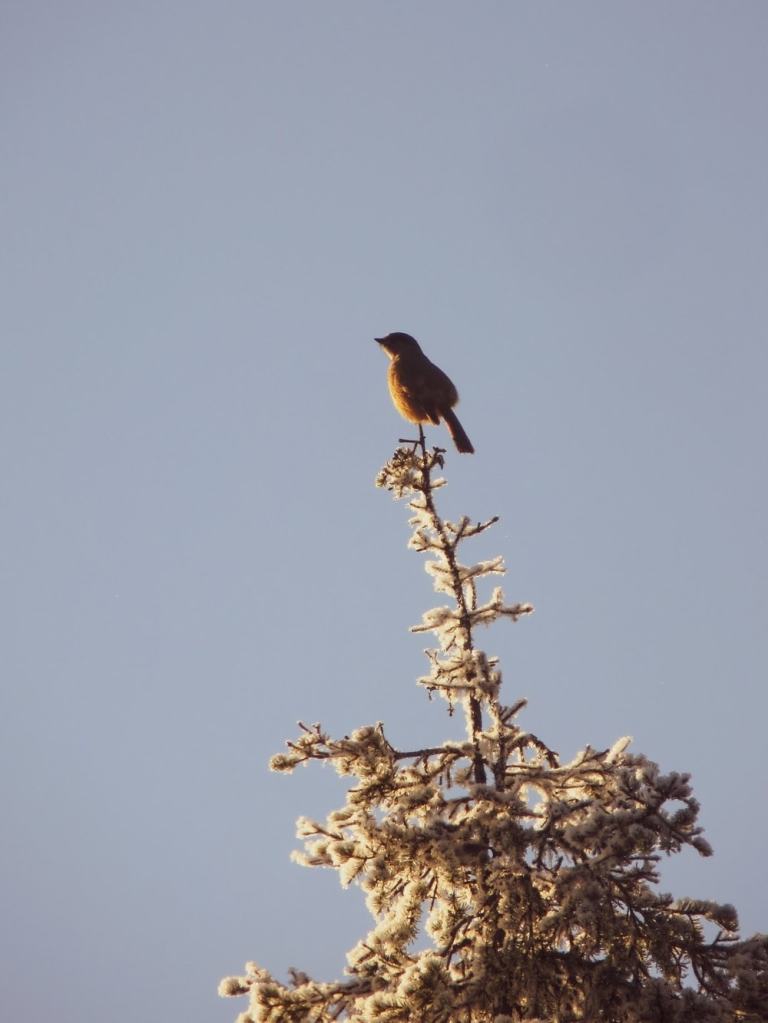 Tänään oli se aamu vuodesta, kun yöllinen kosteus oli käärinyt koivut paksuun kuuraan, ja aurinko kultasi kaiken noustessaan yhdeksän maissa. Pakkasta oli 25 astetta, ja lintulaudalla oli vilkasta heti ensimmäisistä valoisista hetkistä alkaen.