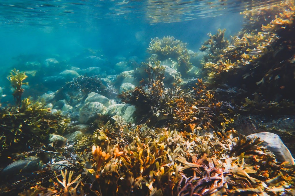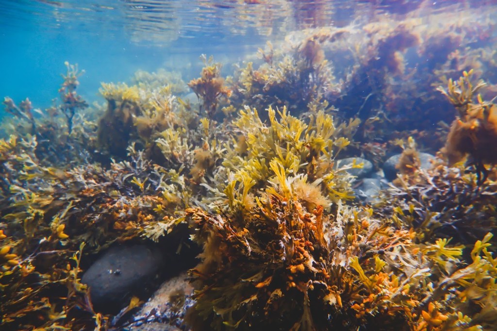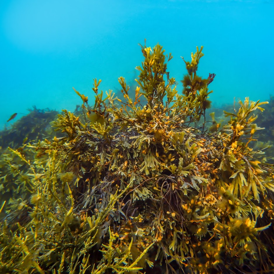 En nähnyt yhtään kalaa mutta jälkikäteen huomasin, että yhteen valokuvaan oli joku pikkuinen eväkäs tallentunut. Pääasiassa kiinnitin huomiotani kauniisiin leviin, jotka hulmusivat matalassa rantavedessä ihanasti.