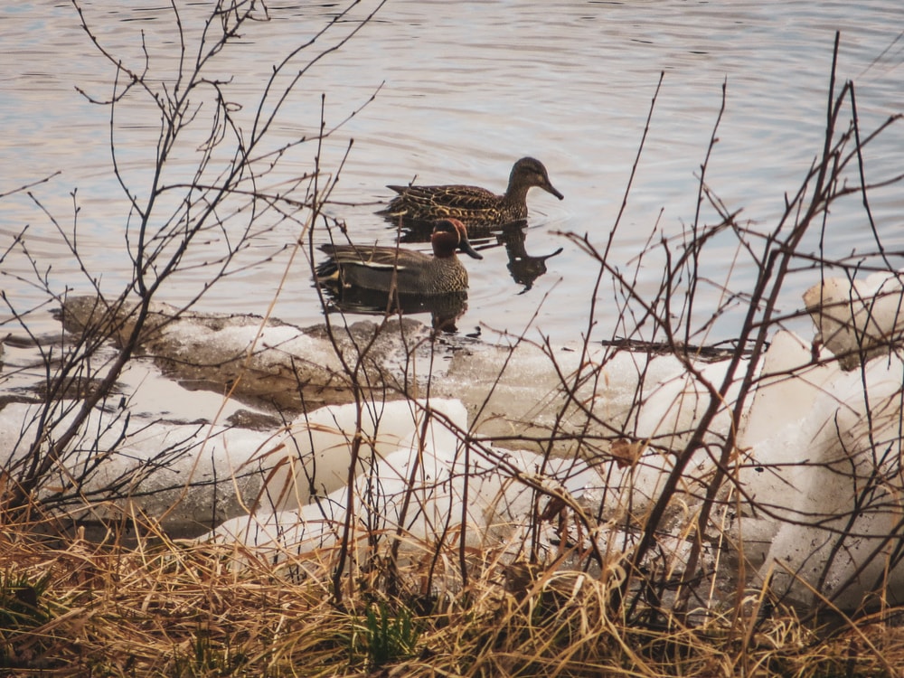 Jäälauttojen reunoilla ja rantametsässä on lintuja, kuten rantasipejä ja sinisorsia. Kuovi huutaa korkeuksista, ja leppälintu taitaa olla asettumassa rantakoivussa olevaan pönttöön. Eilen rannassa kävi sekä iso- että tukkakoskelopariskunta. Lisäksi on telkkiä, joutsenia, västäräkki ja kirjosieppo sekä eilen iltalenkillä huomasin taivaanvuohen ruokailevan niityllä. Lokkeja ja tiiroja liihottelee joella, ja tavipariskunta kävi ruokailemassa tulvivassa pajukossa.