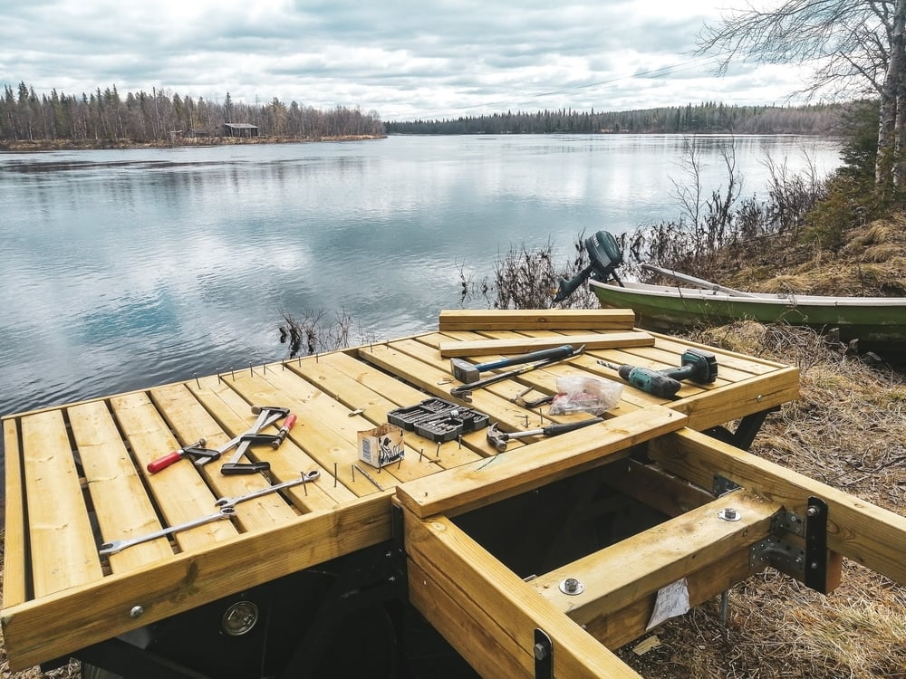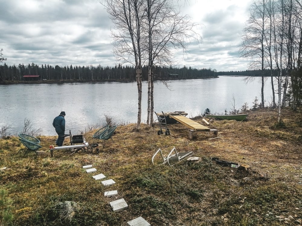 Kaupan kautta kotiin palatessamme vanhempanikin olivat saapuneet. Iskä oli tuonut mukanaan tekemänsä laiturin ja se oli jo nostettu lähemmäs rantaa. Sitä jäinkin seuraavana aamuna hänen kanssaan kasaamaan ja asentelemaan paikkaansa, kun muu seurakunta lähti Särestöniemeen.