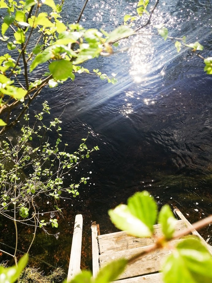 Aamulla sen sijaan kokeilin laskeutua mökin vieressä virtaavaan jokeen, ja sen vesi olikin yllättävän lämmintä. Siinä pulikoin hyvän tovin, ai että, se oli ihanaa. Kesä tuntui kunnolla ensimmäistä kertaa. Harmittamaan jäi vain se, etten ollut ottanut snorkkelia ja vedenalaiskameraa mukaan. Joen vesi oli kirkasta ja siellä kasvoi vehreitä kasveja. Miten ne näin aikaisin kesästä jo niin vehreitä olivat?
