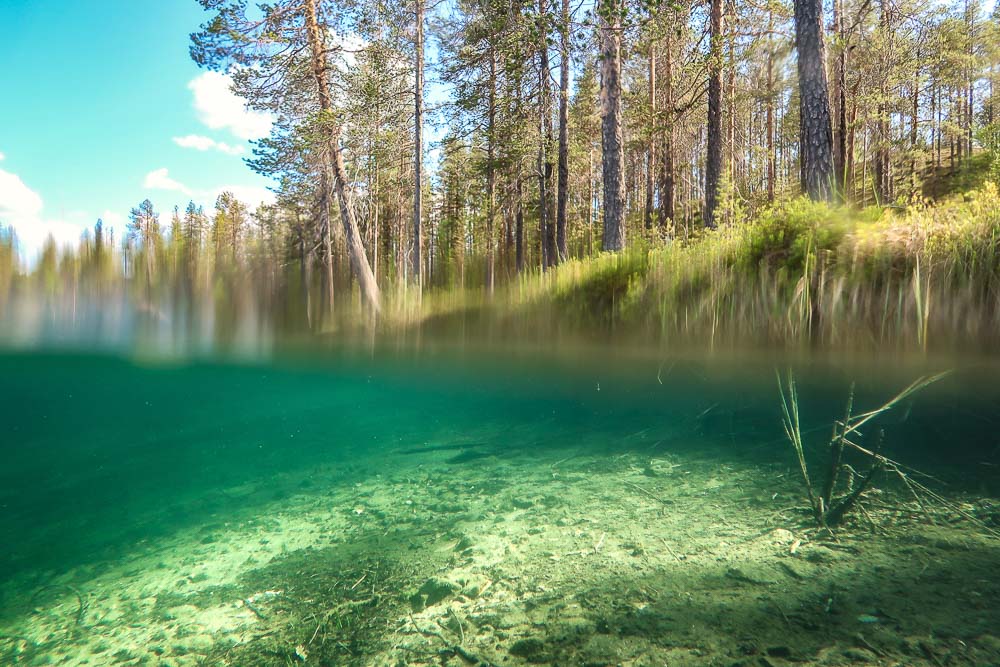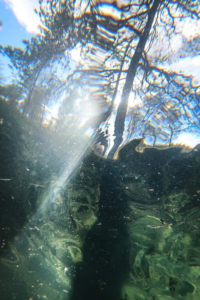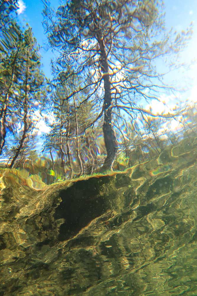 Auringon mentyä pilveen nousin hetkeksi vedestä odottelemaan muhkean pilven ohimenoa. Tämän jälkeen lähdin toiseen suuntaan ja kokeilin ottaa kuvia komeasta rantamänniköstä pinnan alta käsin.