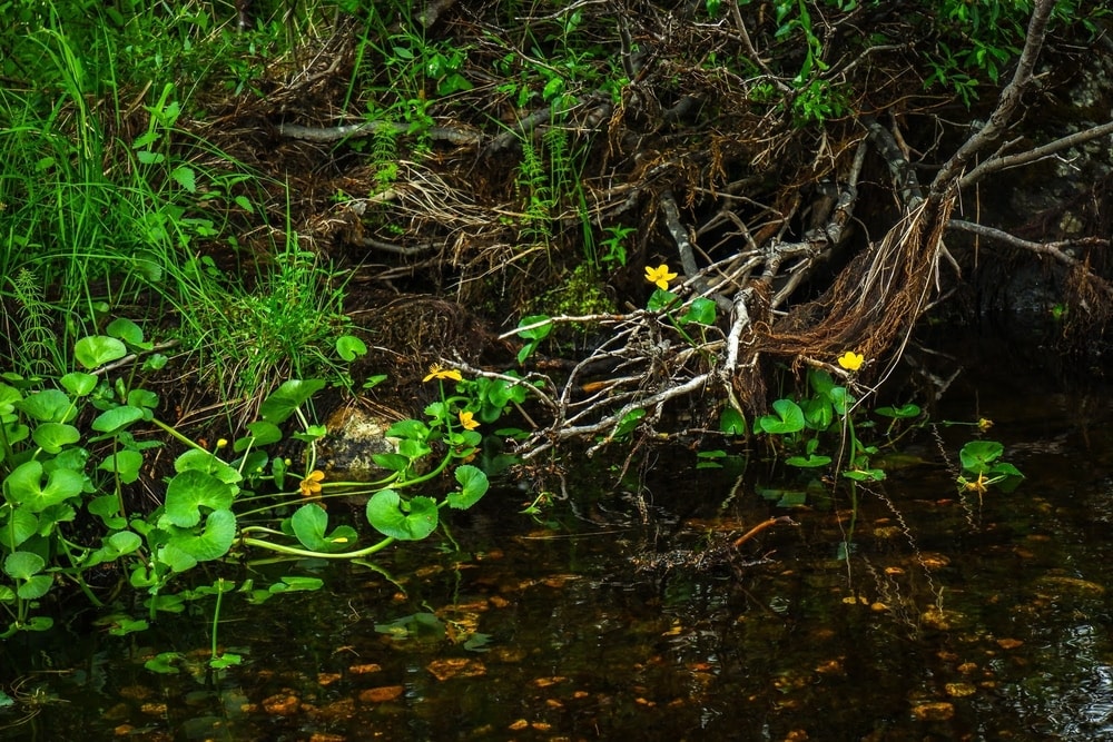 Pienen matkan päässä sama joki näytti olevan lähes täydellisesti rentukoiden peittämä. Sinne oli kuitenkin matkaa ja välissä oli litimärkä suo, joten en lähtenyt sinne saakka lorkkimaan – kuvasin pitkällä zoomilla vain tieltä käsin.