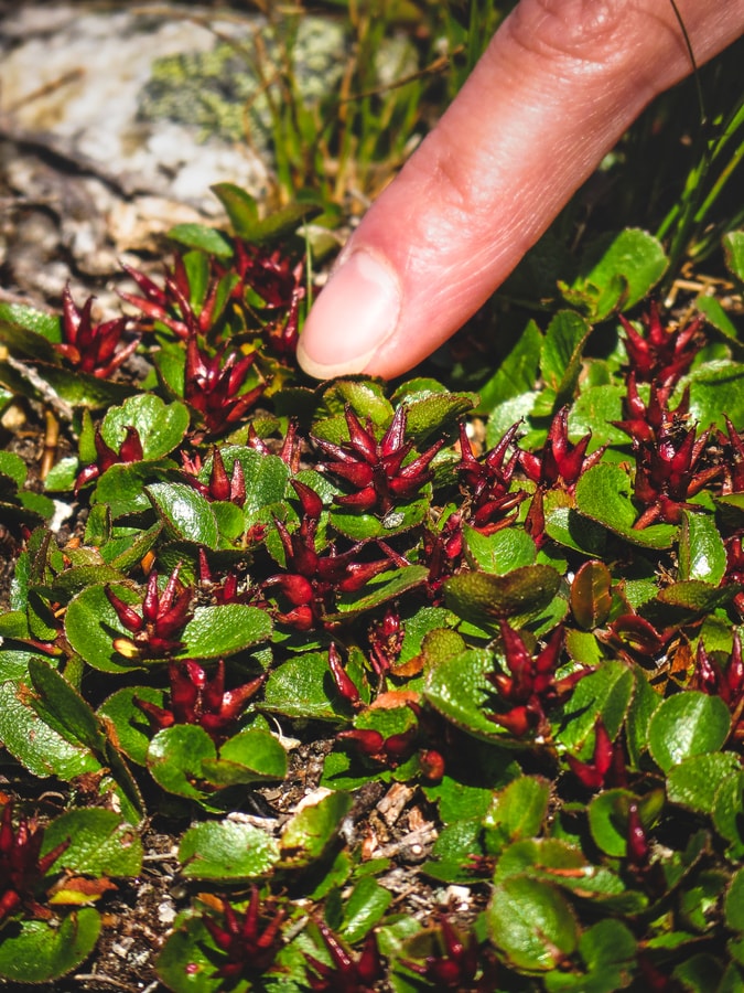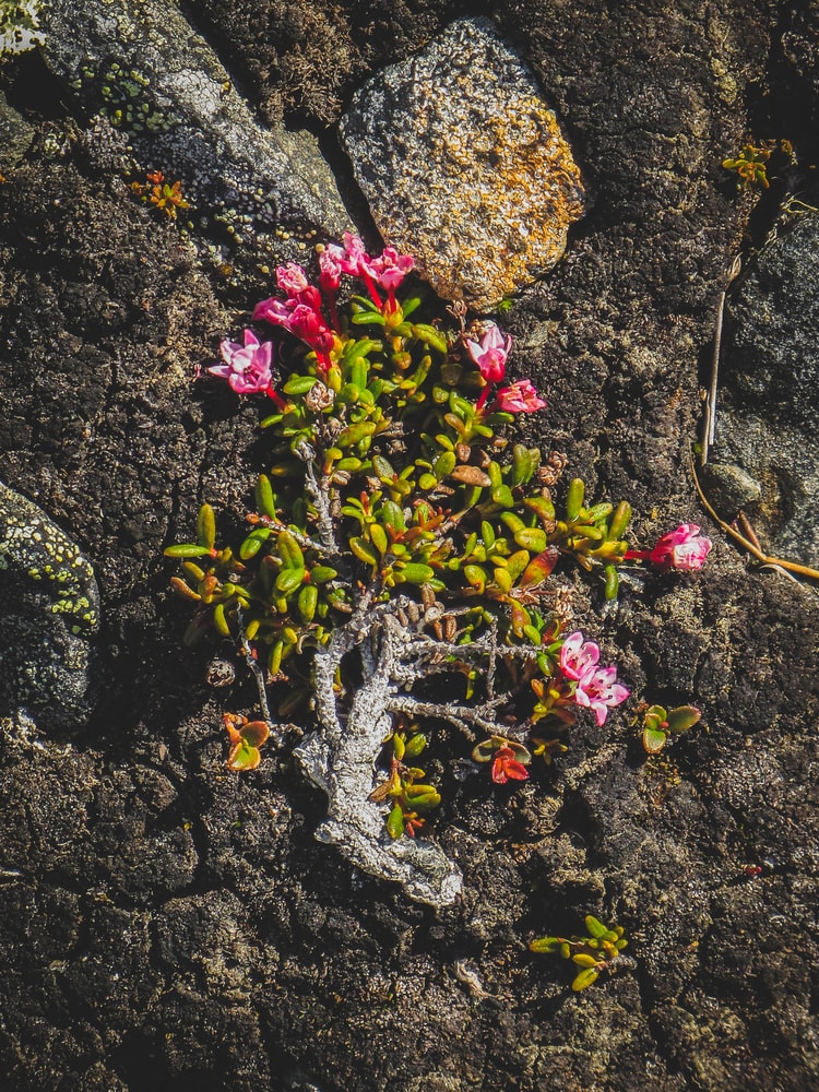 Ennen huippua oli hieman jyrkempi ja kivikkoisempi nousu, mutta se tuntui loppuvan melkein ennen kuin pääsi alkuunkaan. Ei yhtään valehuippua – tunturin laki oli juuri siinä missä se näyttikin olevan. Matkanteko oli kuitenkin hidasta paitsi kivikon vuoksi myös siksi, että koko ajan piti kyykätä tutkimaan pieniä kukkia hieman lähempää.