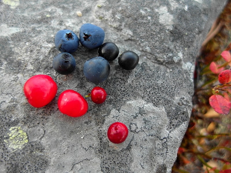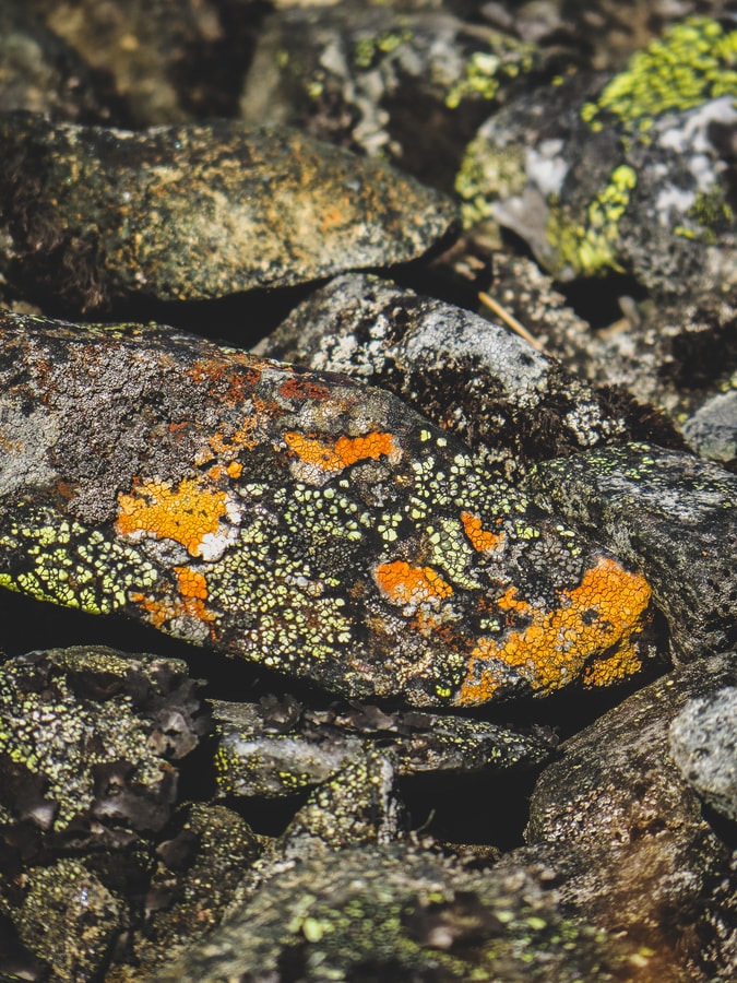 Tällä kertaa tunturi oli vihreä ja pinkki – pikkuiset tunturikukat tuntuivat olevan kaikki täydessä loistossaan. Kurjenkanerva, suokukka, hilla, lapinkuusio sekä pikkiriikkiset uuvanat ja sieliköt koristivat maisemaa. Kivien oranssit, punaiset, vihreät ja harmaat jäkäläkuviot toivat mieleeni Jurmon. Muistelimmekin Essin kanssa yhteistä Jurmon-retkeämme ja lähinnä mitä kaikkea hyvää meillä siellä oli eväänä.