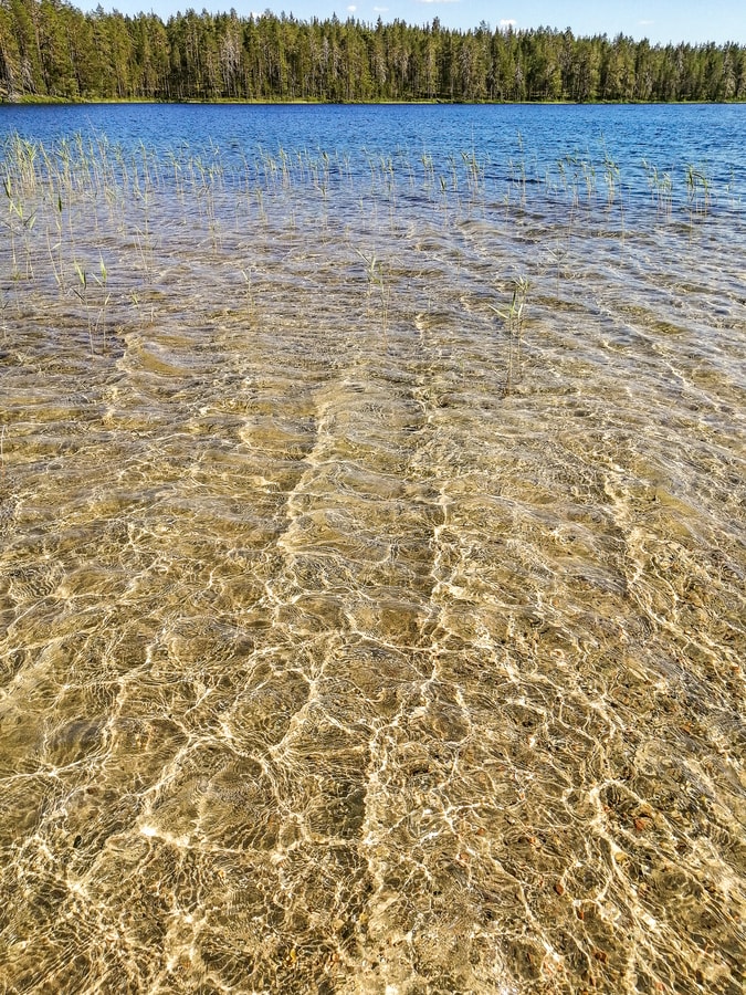 Ennen kotimatkalle lähtöä halusin käydä kurkkaamassa yhden järven vielä, Umpi-Valkeaisen. Vaikka tällä kierroksella ei kaloja näkynyt, oli järven kaunis maisema ja kirkas vesi aivan paratiisimainen yhdistelmä. Valkoinen hiekka, punaiset huojuvat vesikasvit ja vihreä nurmikko järven pohjalla näkyivät kirkkaana auringon ihanassa valossa. Näkyvyyttä oli niin monta metriä, että en osaa edes arvioida. Uin aika syvällä ja pohja näkyi upeasti silloinkin. Äärimmäisen hieno lopetus reissulle ❤