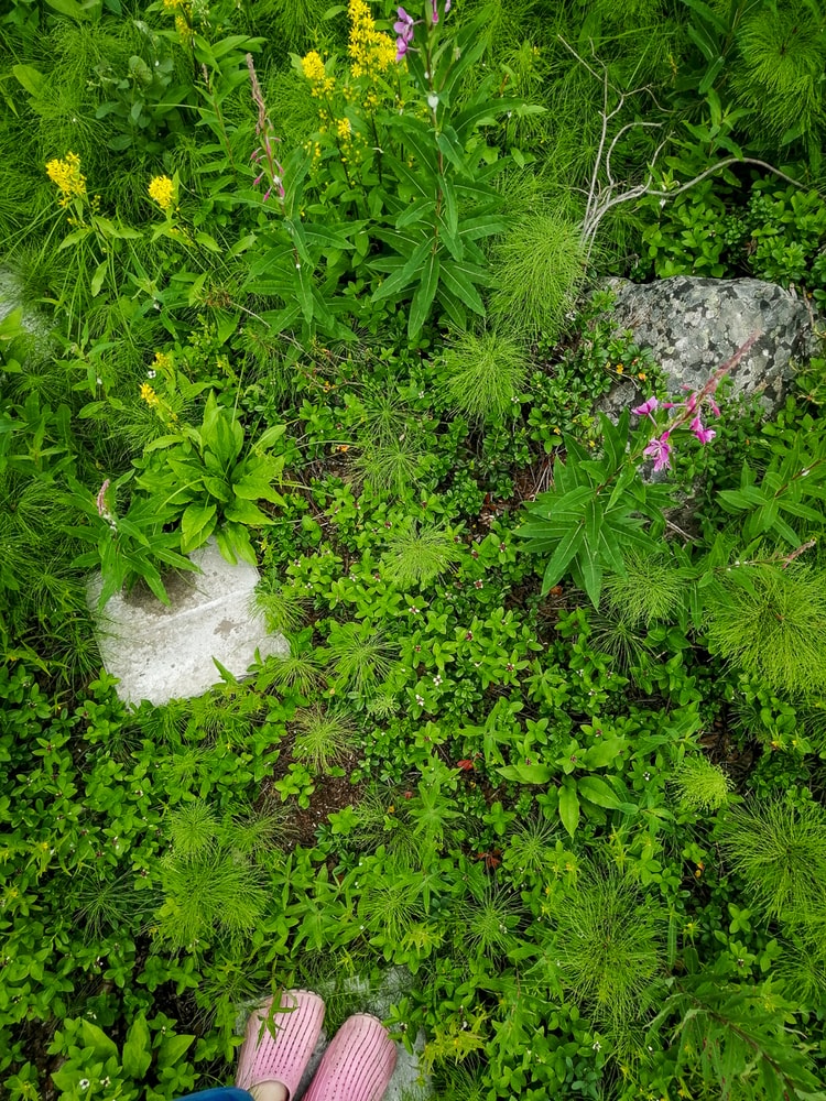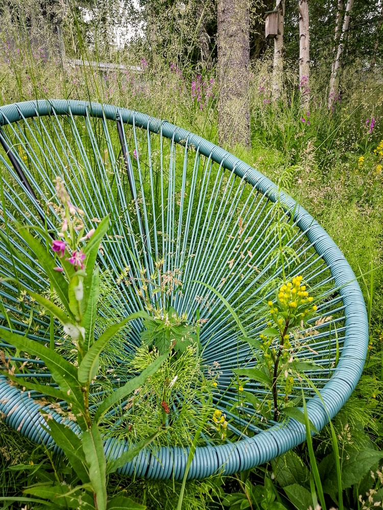 Nautin siitä kun saan antaa luonnonkukkien kasvaa siellä missä ne haluavat. Kimalaiset pöristelevät kukasta kukkaan, ja kukkia todella riittää – omalla pihallamme kasvaa mm. maitohorsmaa, talvikkia, oravanmarjaa, metsätähteä, kulleroa, mesimarjaa, metsäkurjenpolvea ja monia sellaisia kasveja, joita en tunnista. Myös heiniä ja muita kukkimattomia kasveja. Pöntöissä pesiville pikkulinnuille riittää apetta, hauki löytää suojaa kasveja kasvavasta rannasta. Trimmerillä pidämme rakennusten seinustat kasveista vapaina, jotta kasvit eivät ala lahottaa rakennusten helmoja. Kymmenen minuutin trimmeröinti pari kertaa kesässä riittää.