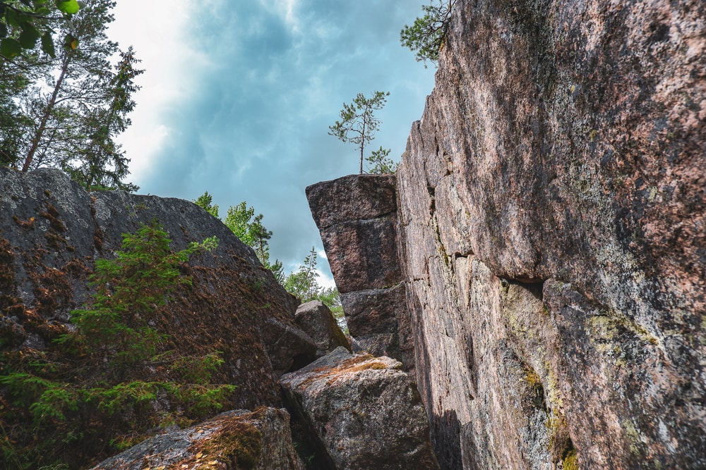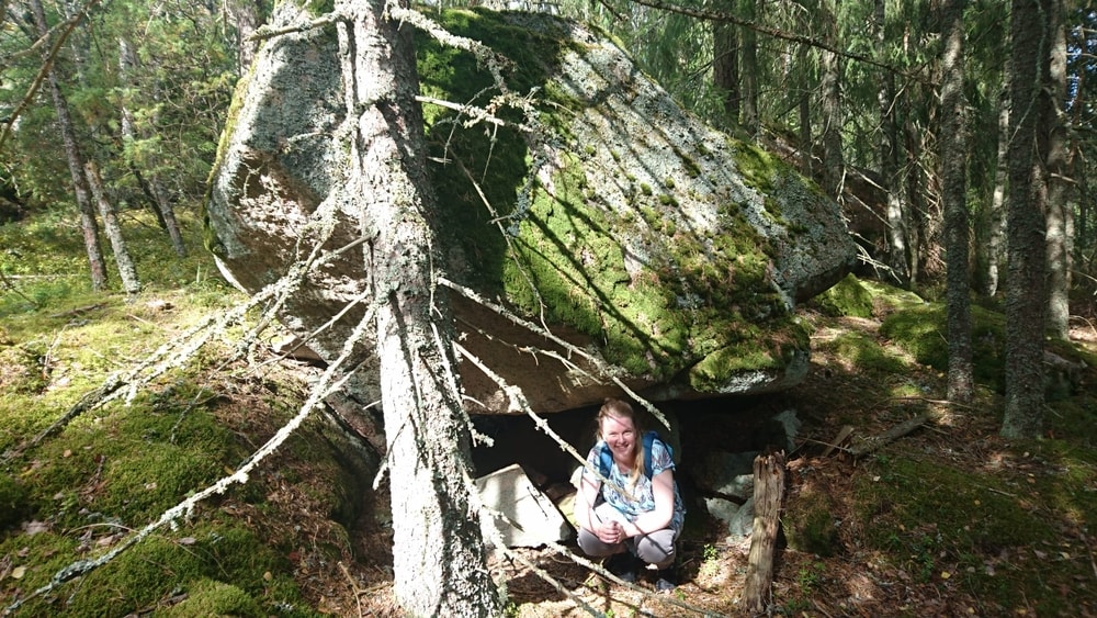Pienen polun alkua piti hetken aikaa etsiskellä, mutta löysimme sen kyllä kunhan luin Karoliinan Retkipaikka-jutun tarkemmin. Jo muutaman askeleen jälkeen alkoi löytyä valtavia lohkareita, joiden alla oli luolamaisia tiloja.
